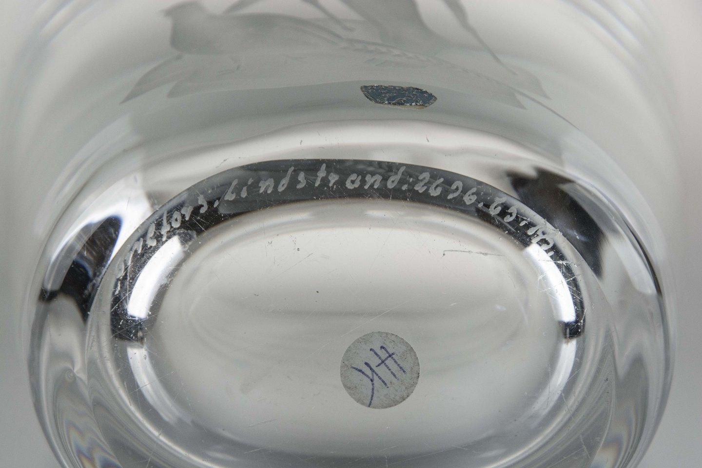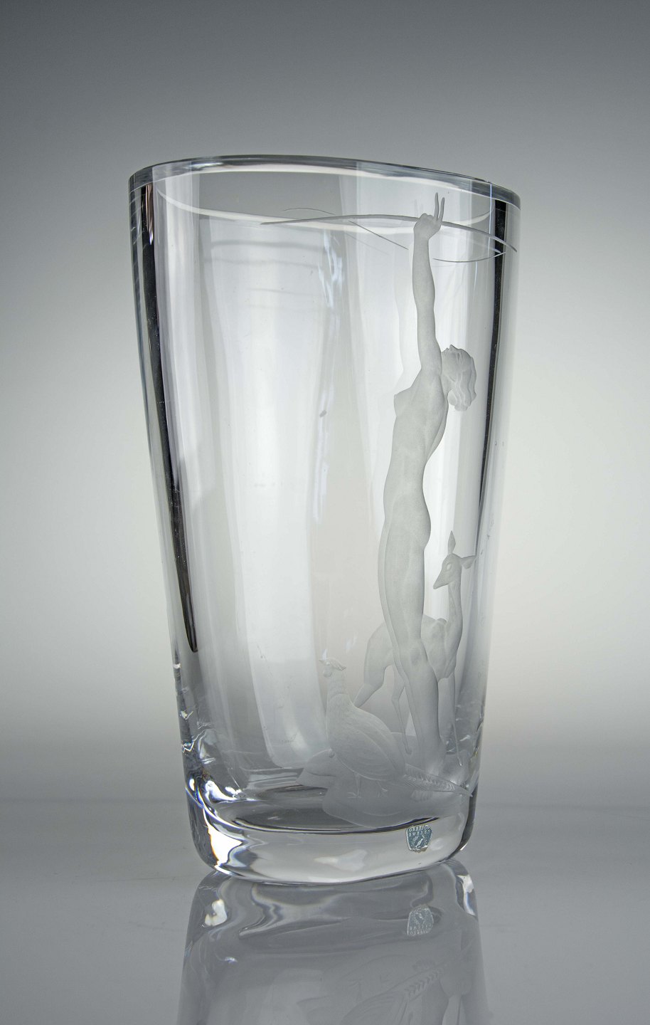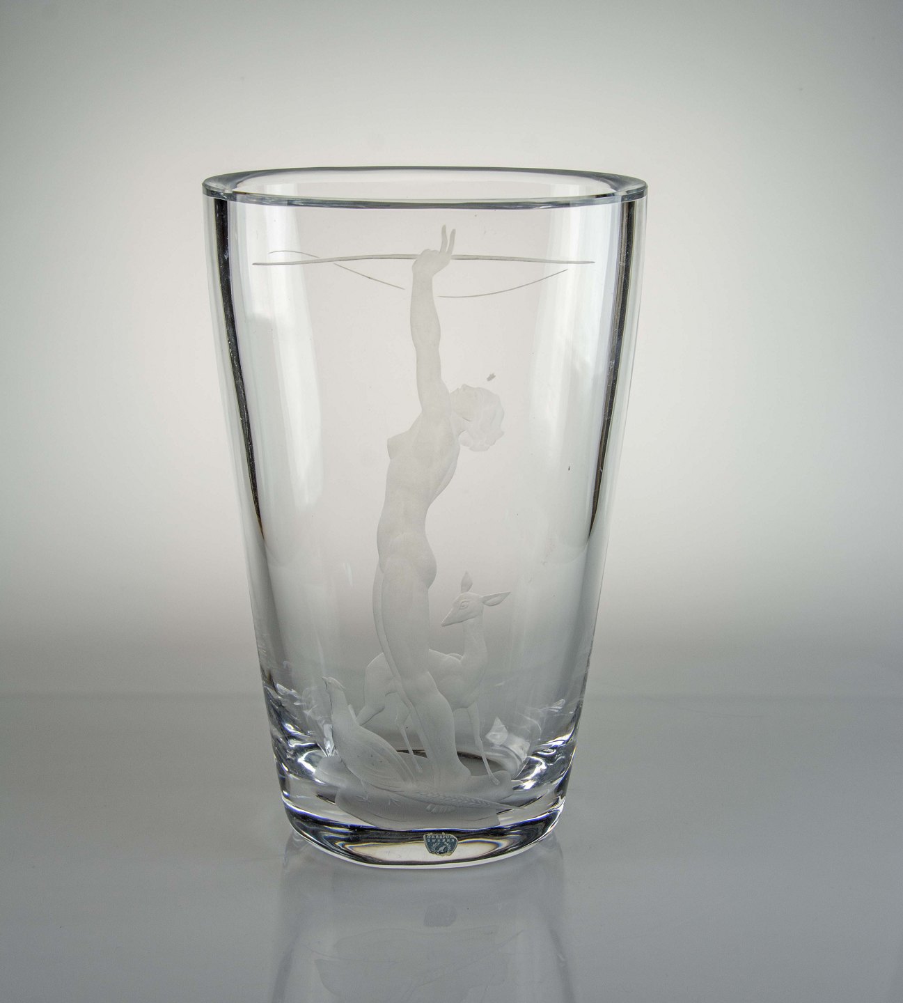 Vase i glas med indgraveret motiv af kvinde med bue, dådyr og fasan nr. 2696