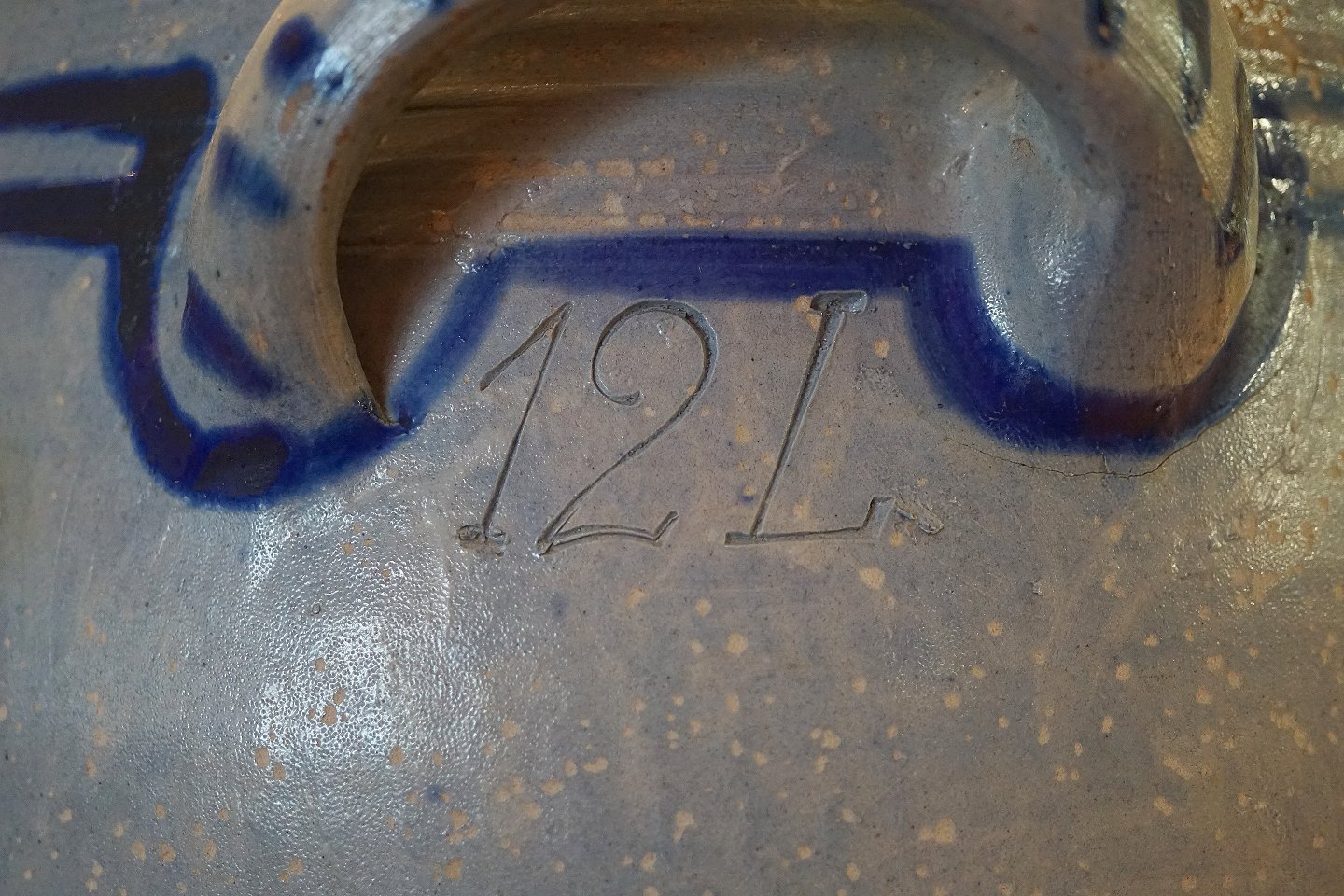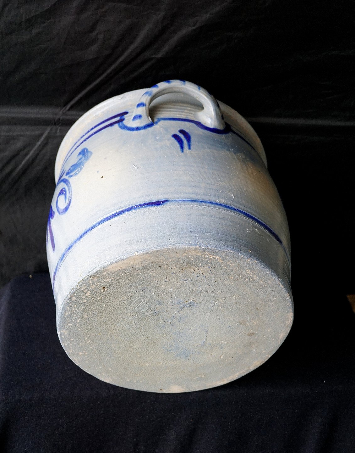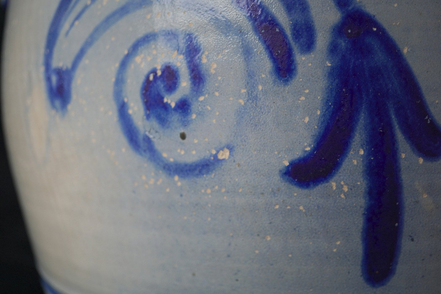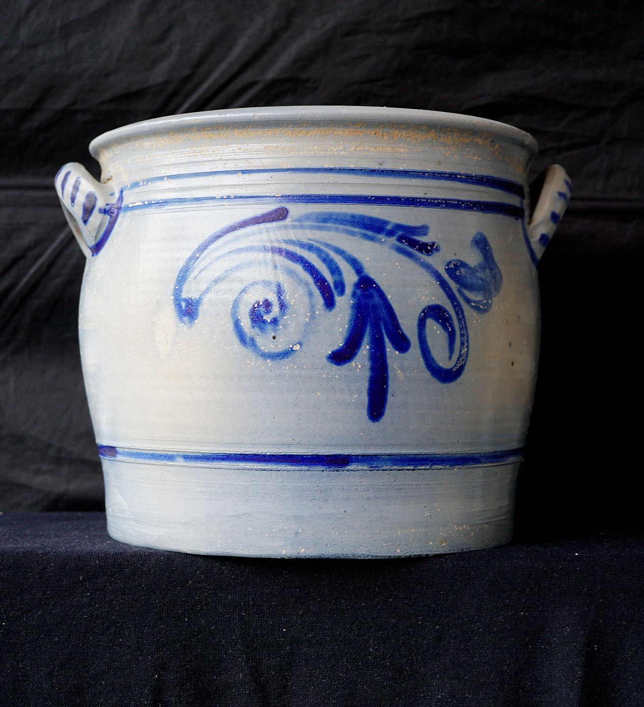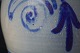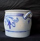 Saltglaseret gråt stentøj med blåt mønster, hollandsk syltekrukke.