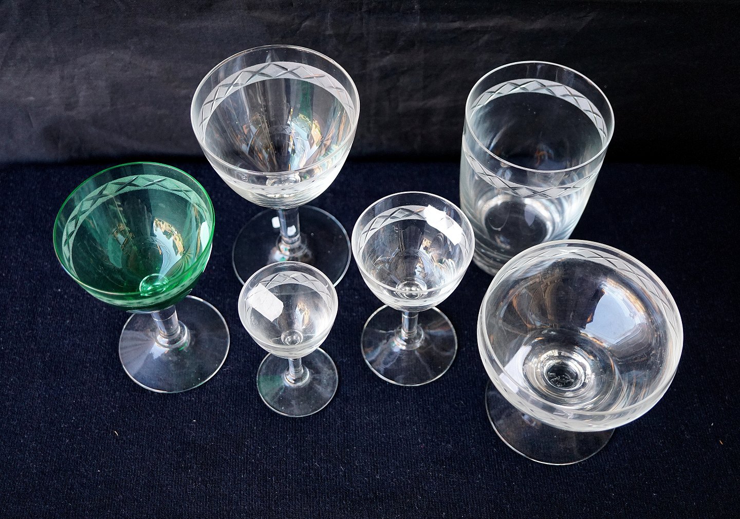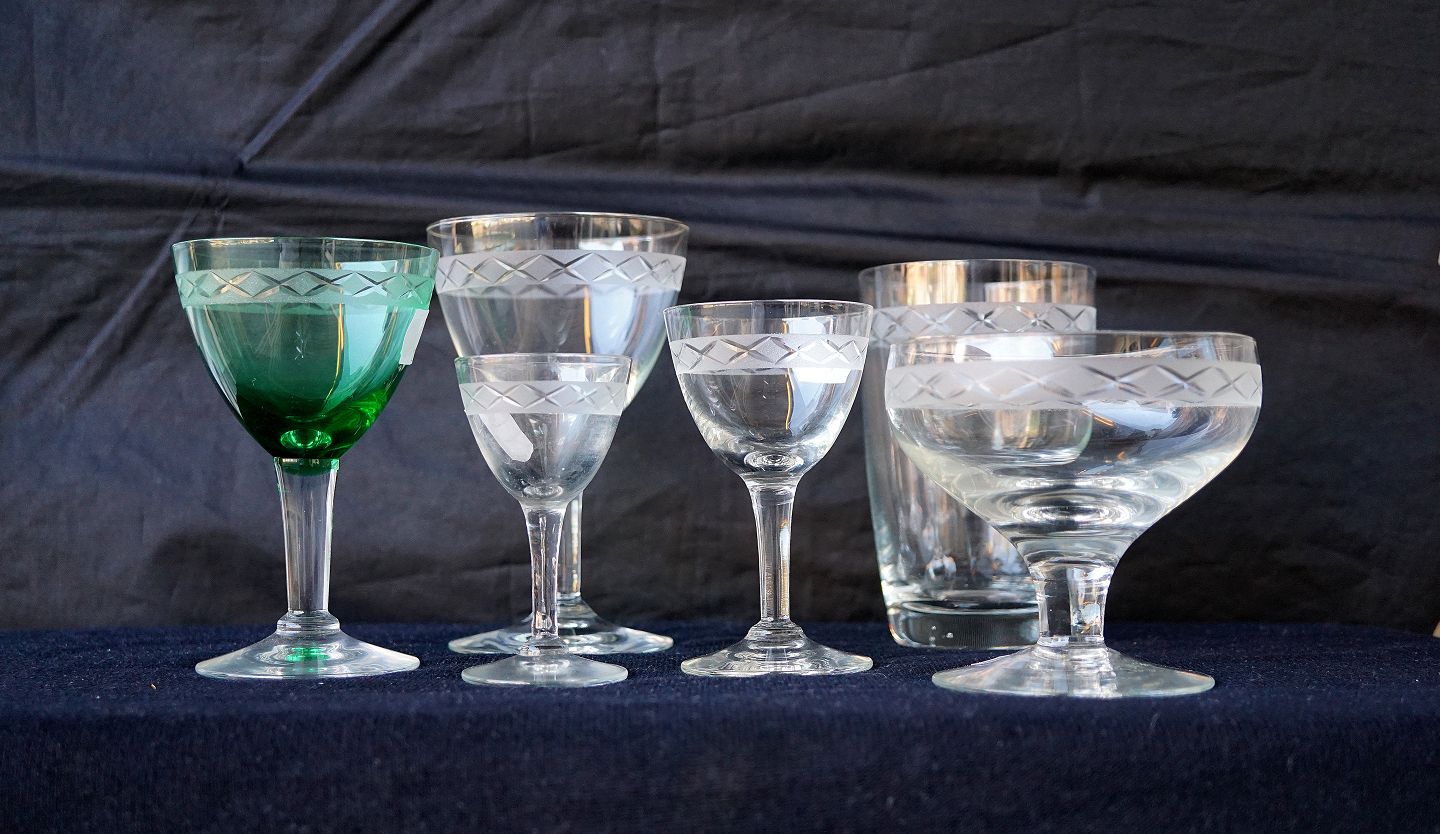 Ejby glas, der er forskellige glas inklusive hvidvinsglas med grøn kumme. Glassene har båndslibninger med blanke kryds på krumme og glat stilk