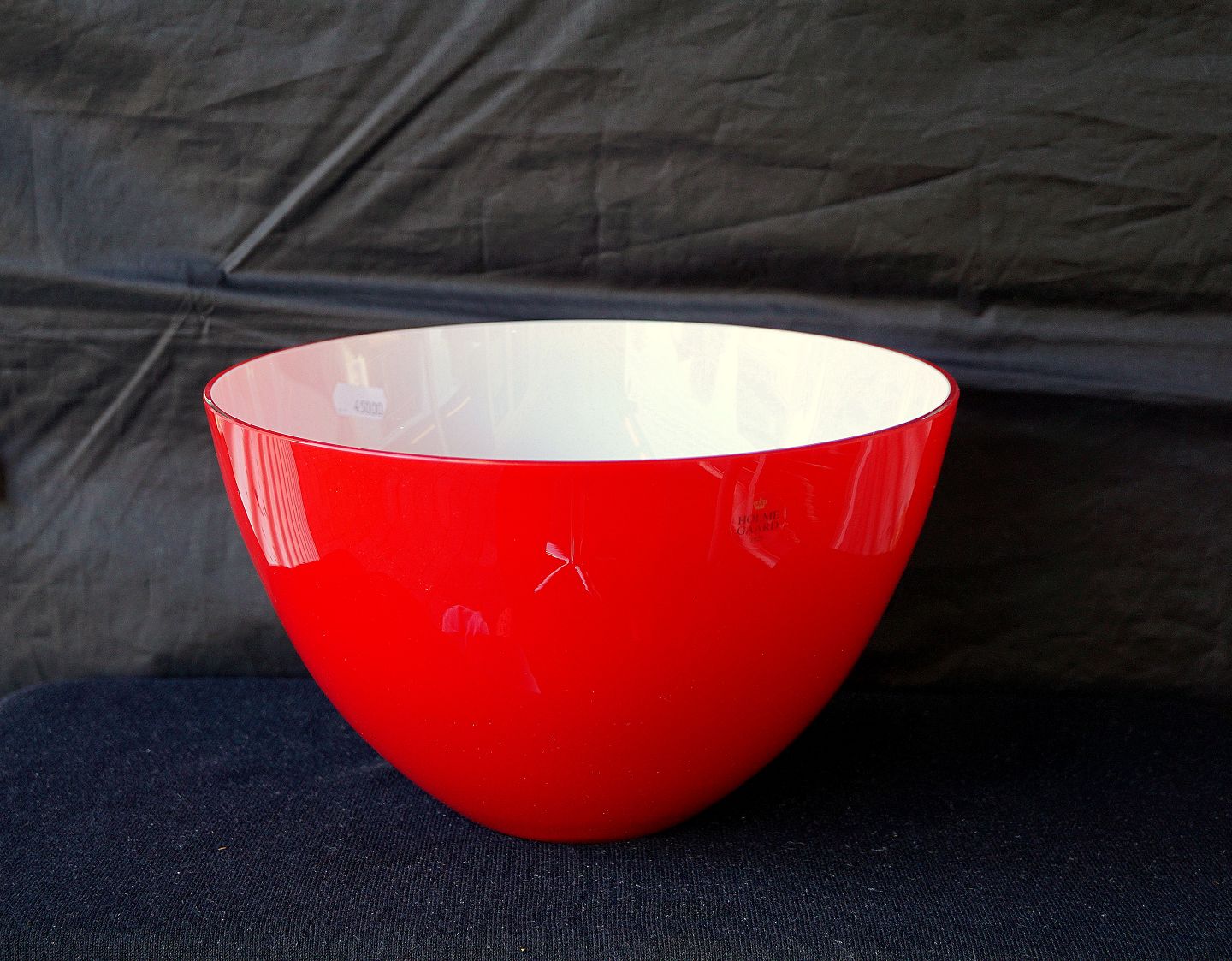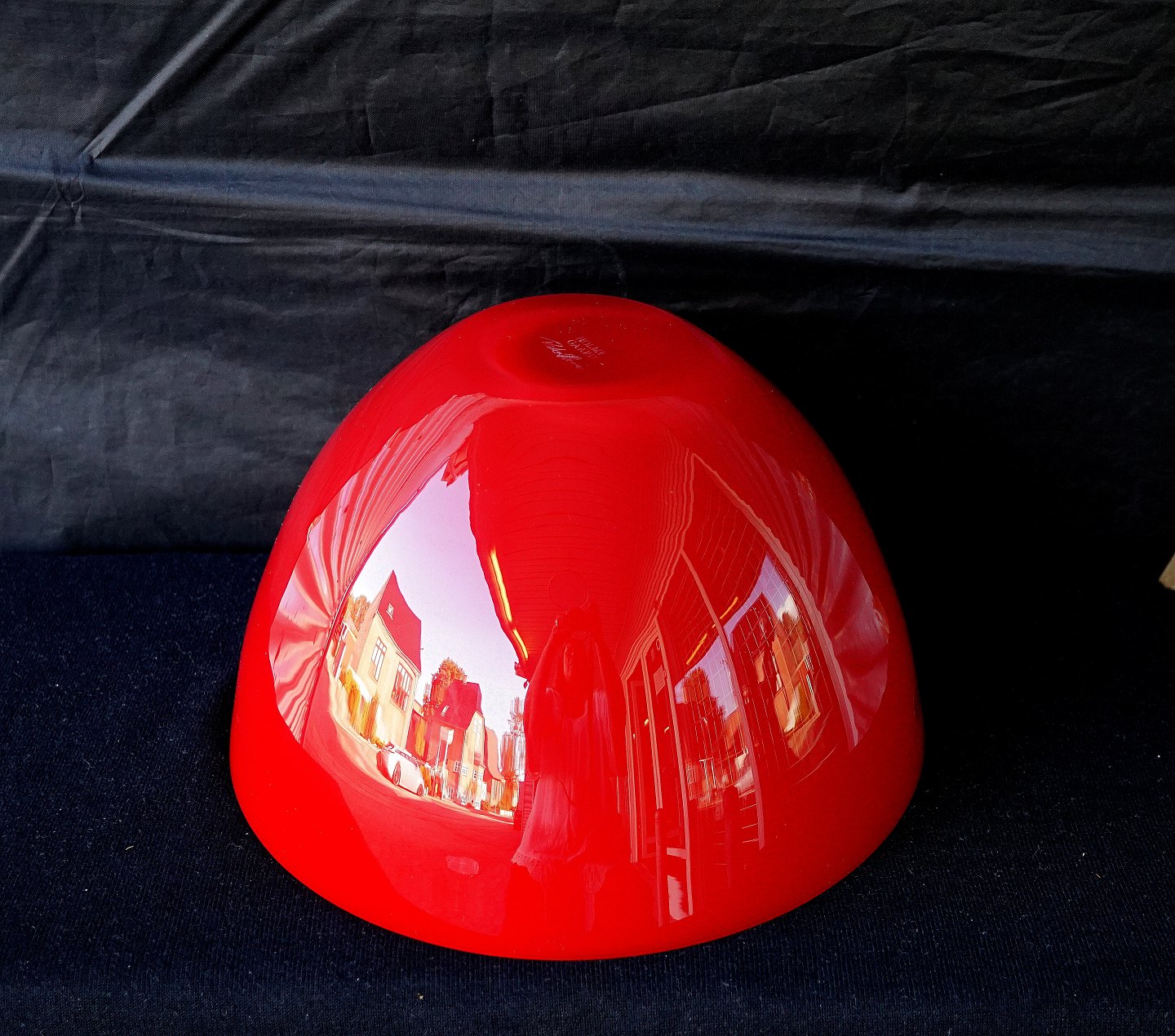 Rød Cocoon skål, opalglas med rødt overfang. Navnet på designer er sandblæst i bund af skål