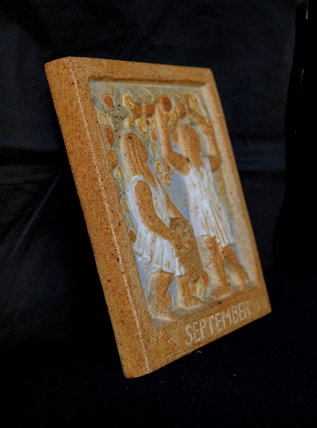 Månedsrelief, i stentøj, mand og kvinde der plukker frugter (september)