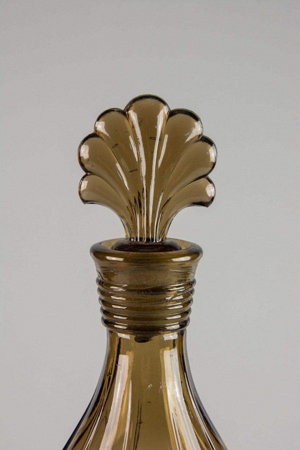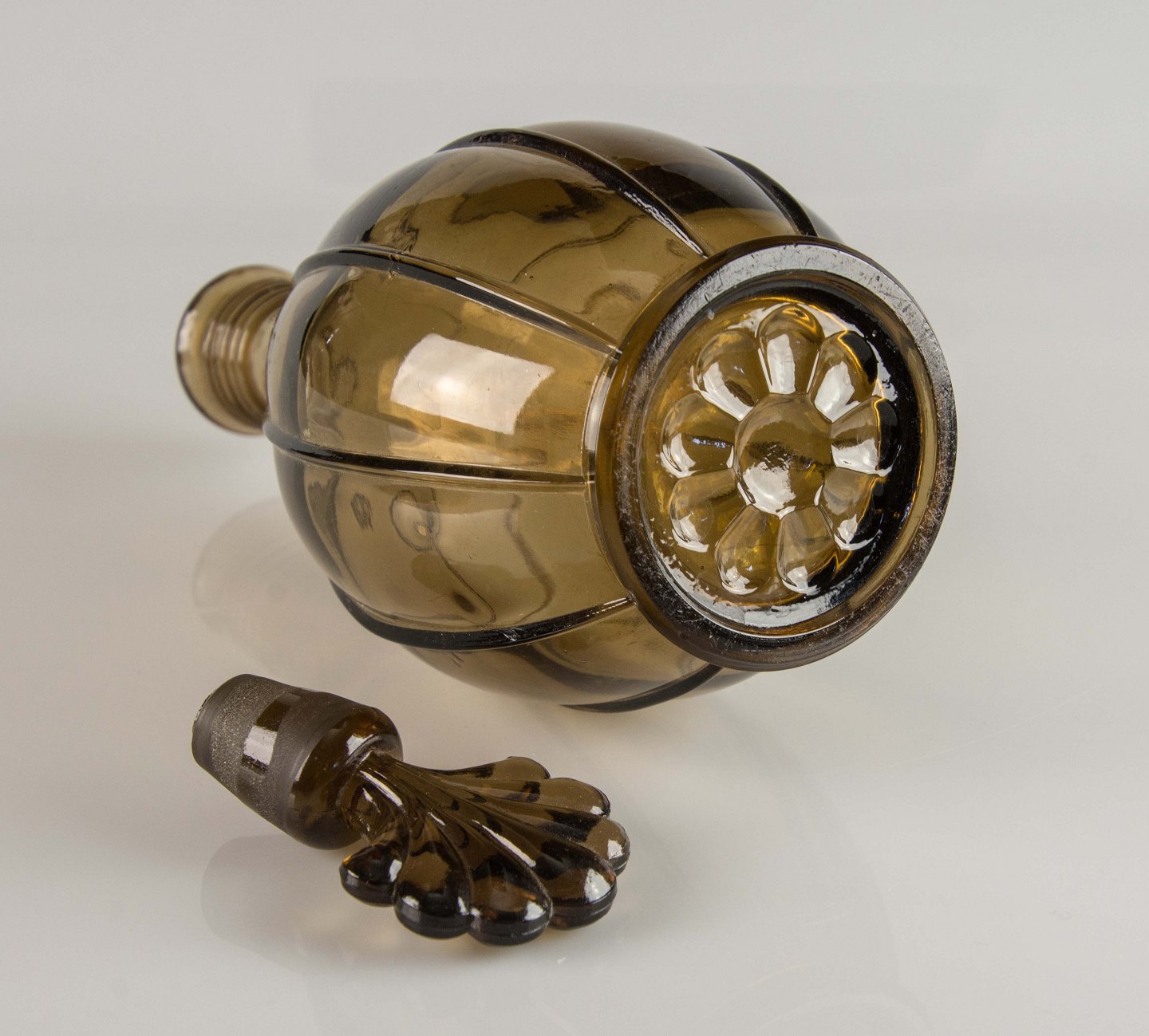 Karaffel i presset brunt glas med glasprop i dansk design