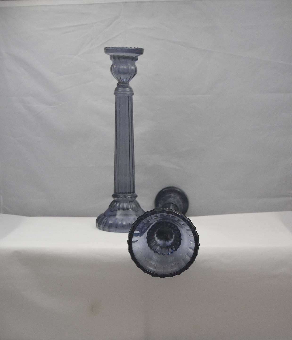 2 gennemsigtige lillalysestager, stagerne er i presset glas