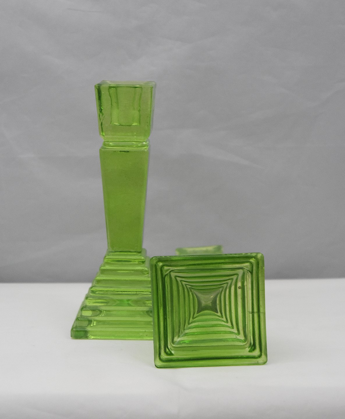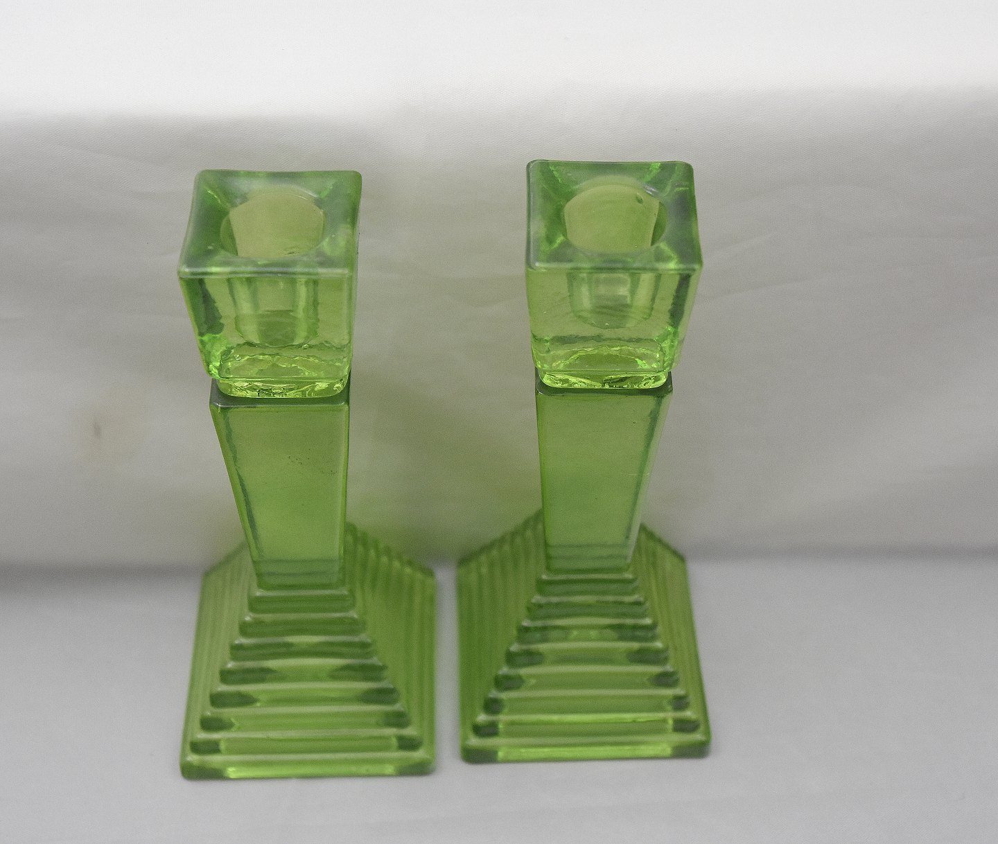 2 kantet grønne lysestager, i klart presset glas. Jugendstil