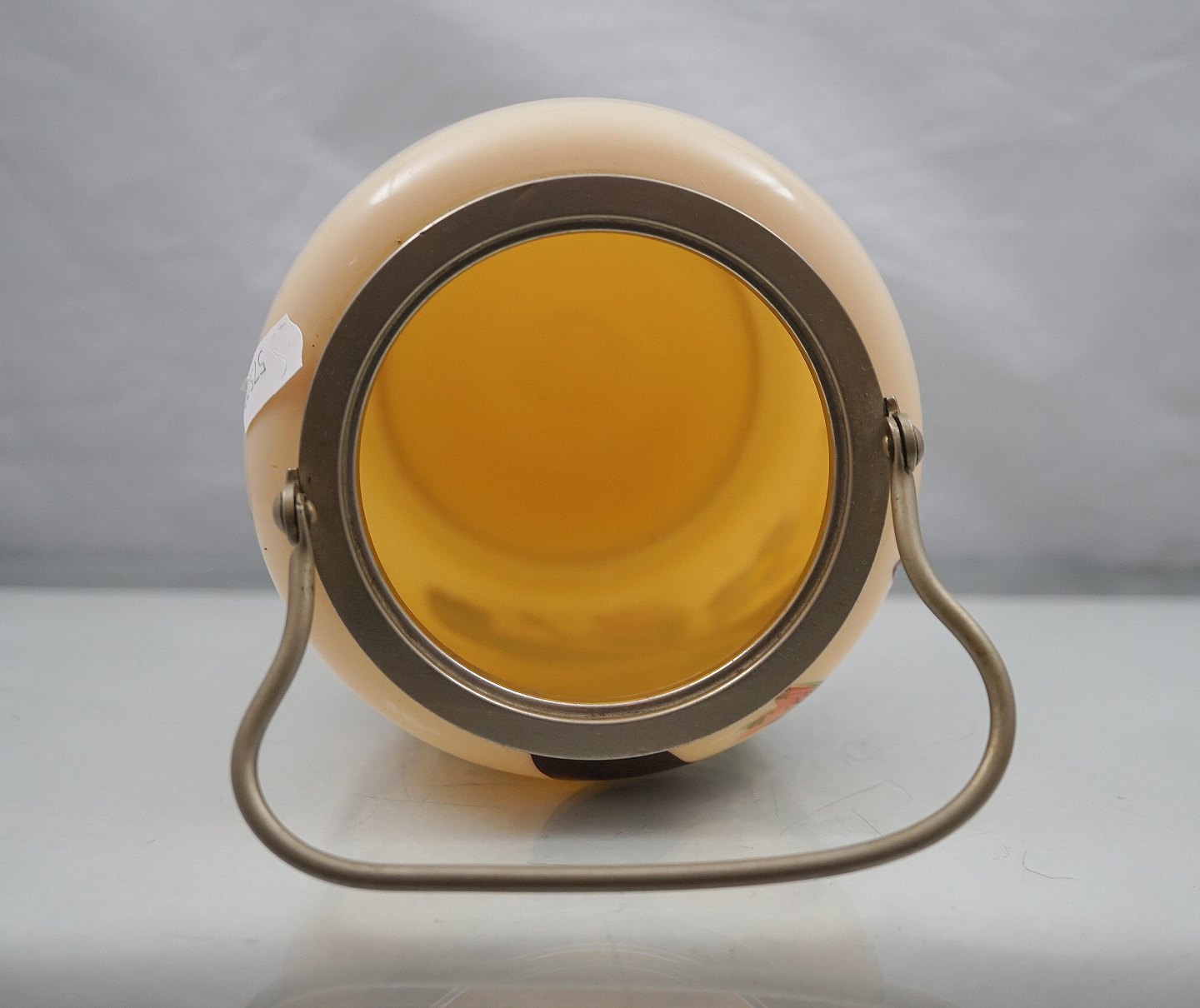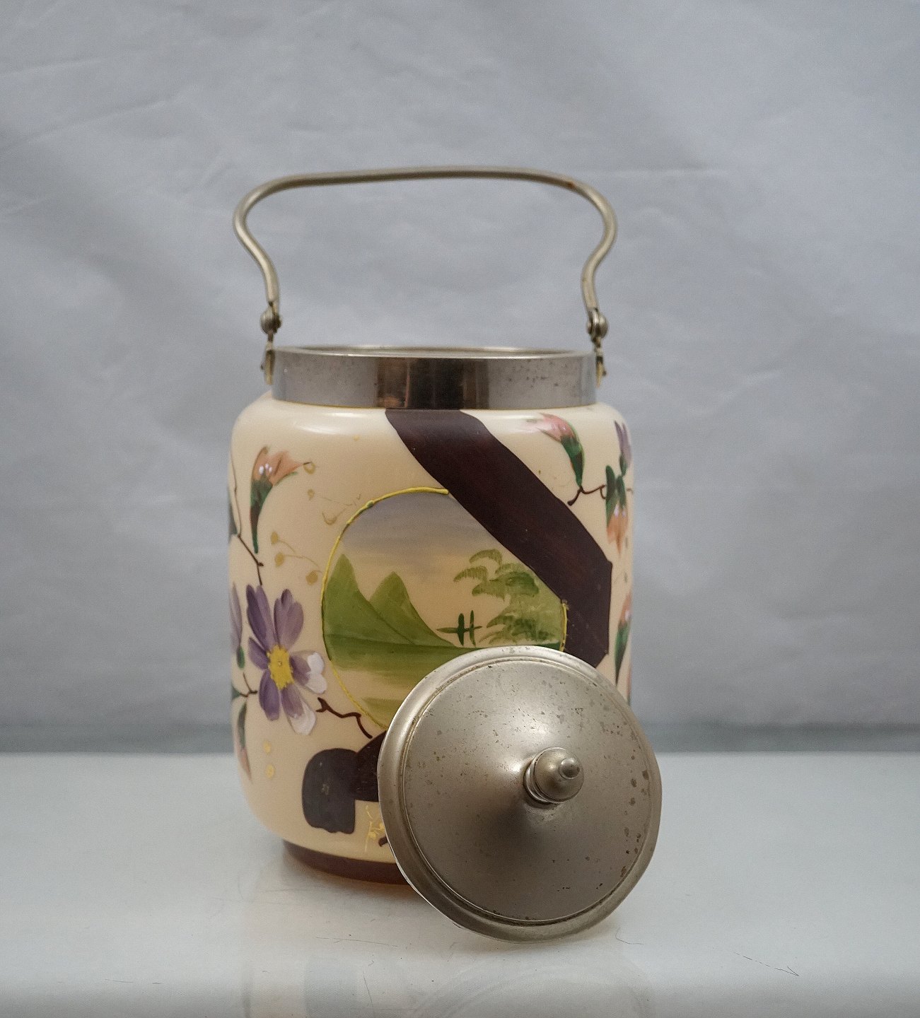 Kiksespand, Bisquitdåse, glas, opal glas, rosa, kinesisk, landskab, blomster, stål