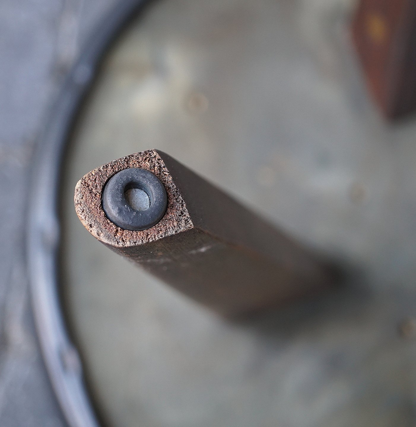 Taburet/skammel med teaktræsben, der er indlagte stolesøm i benene. Taburetten/skamlen er betrukket med kunstlæder. Benene er sat i med messingdyvler