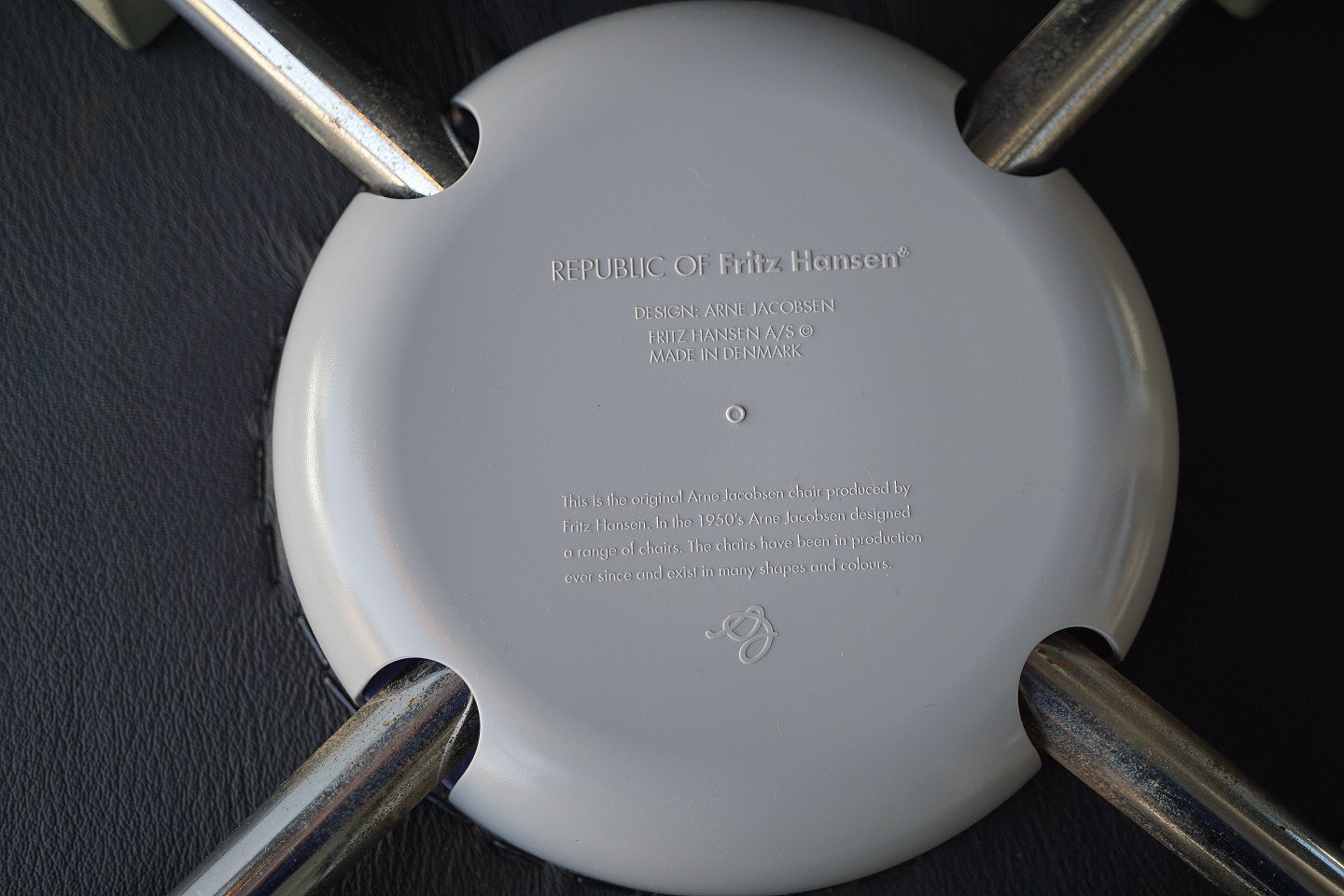 Arne Jacobsen, 6 styk T-stole spisebordsstole. Stolene er ombetrukket med sort læder af klassisk kvalitet.