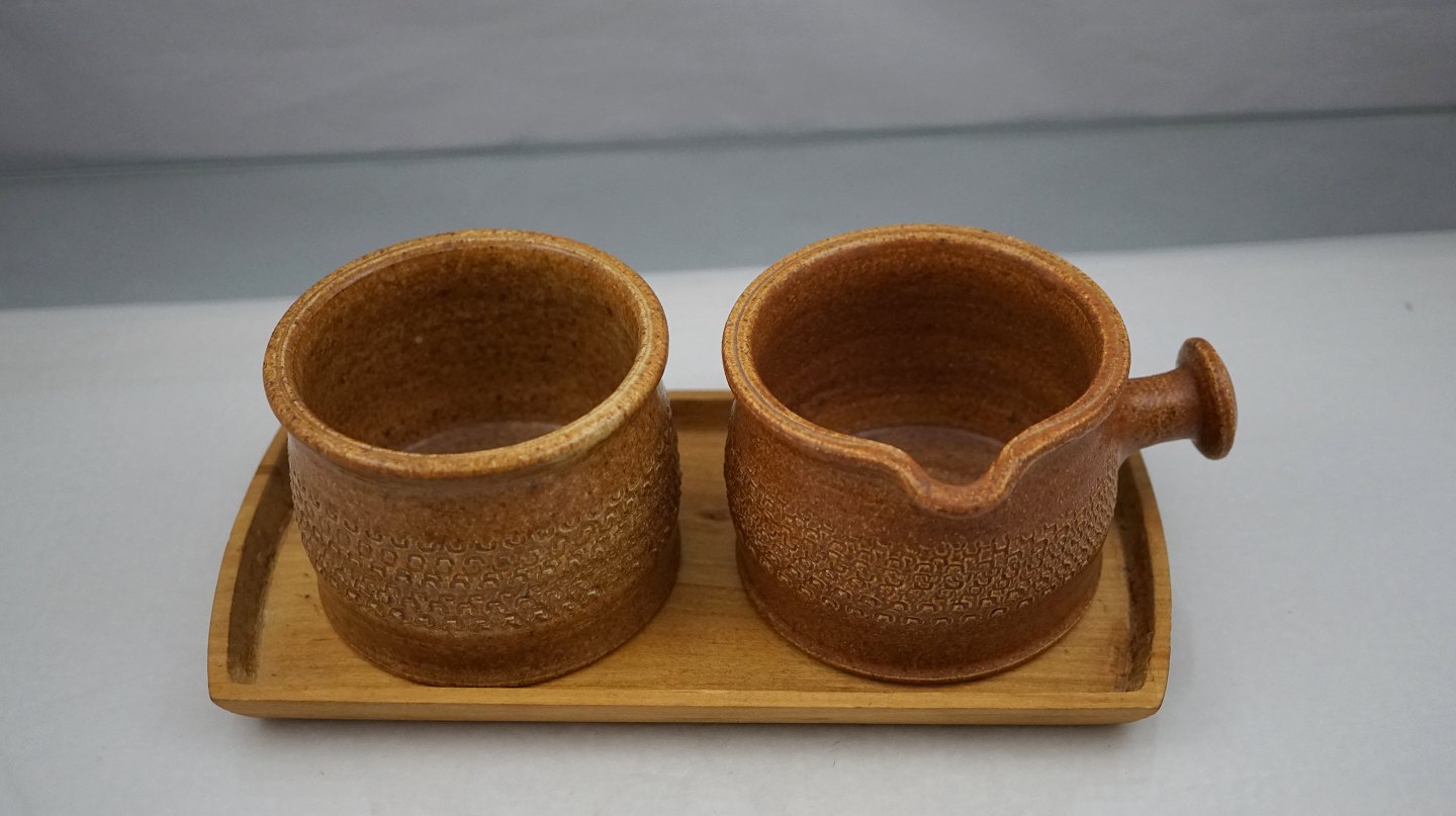 Sukkerskål og flødekande, udført i keramik, uden bakke.
