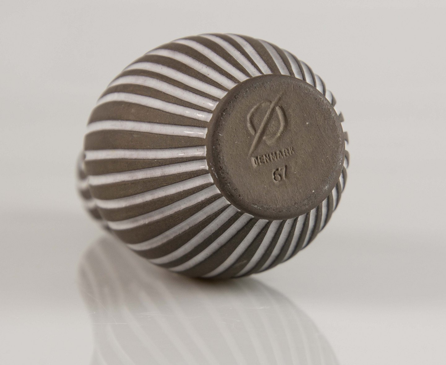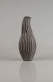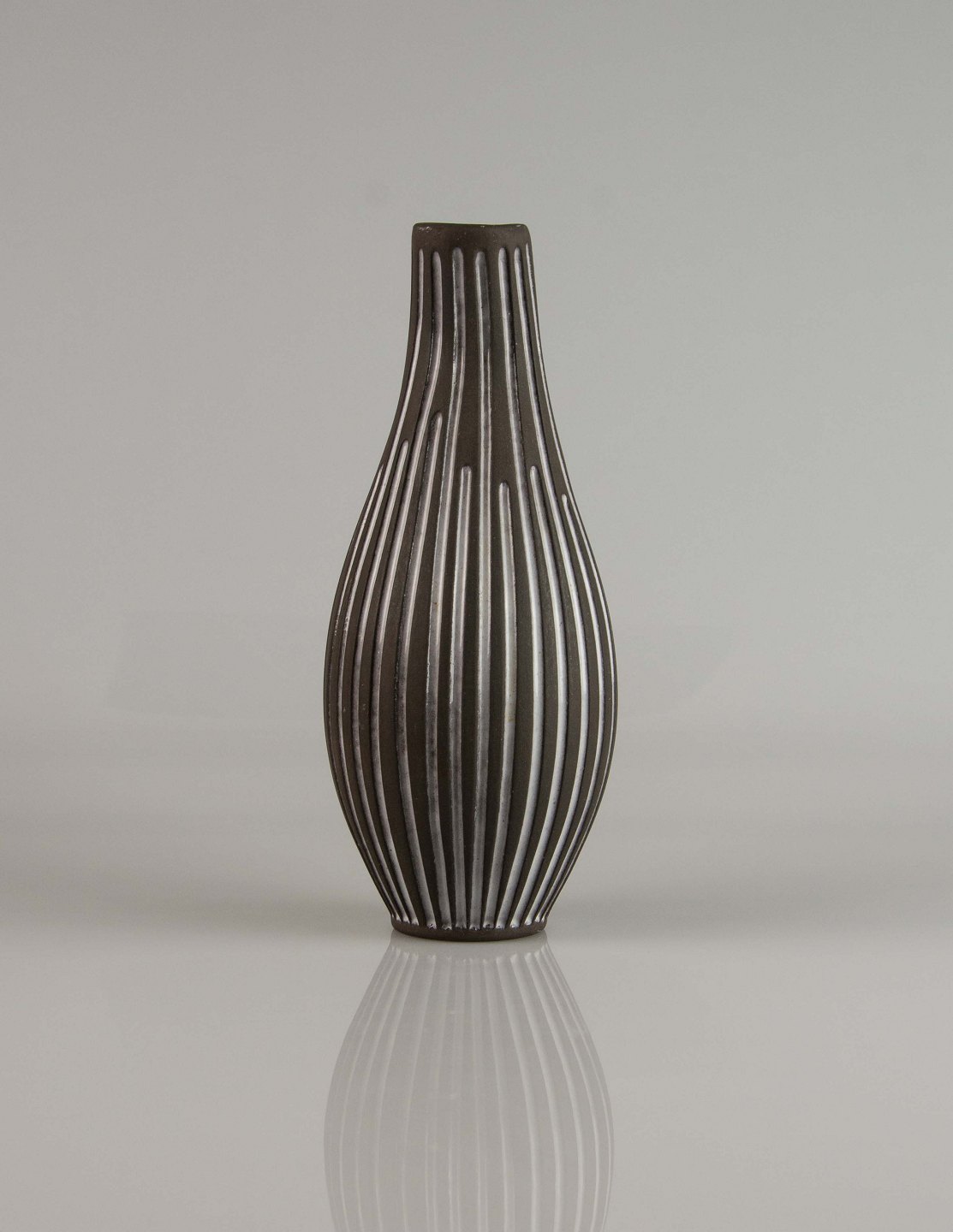 Keramik vase. Vasens hals er lidt skæv. vasen er brun og med hvid striber