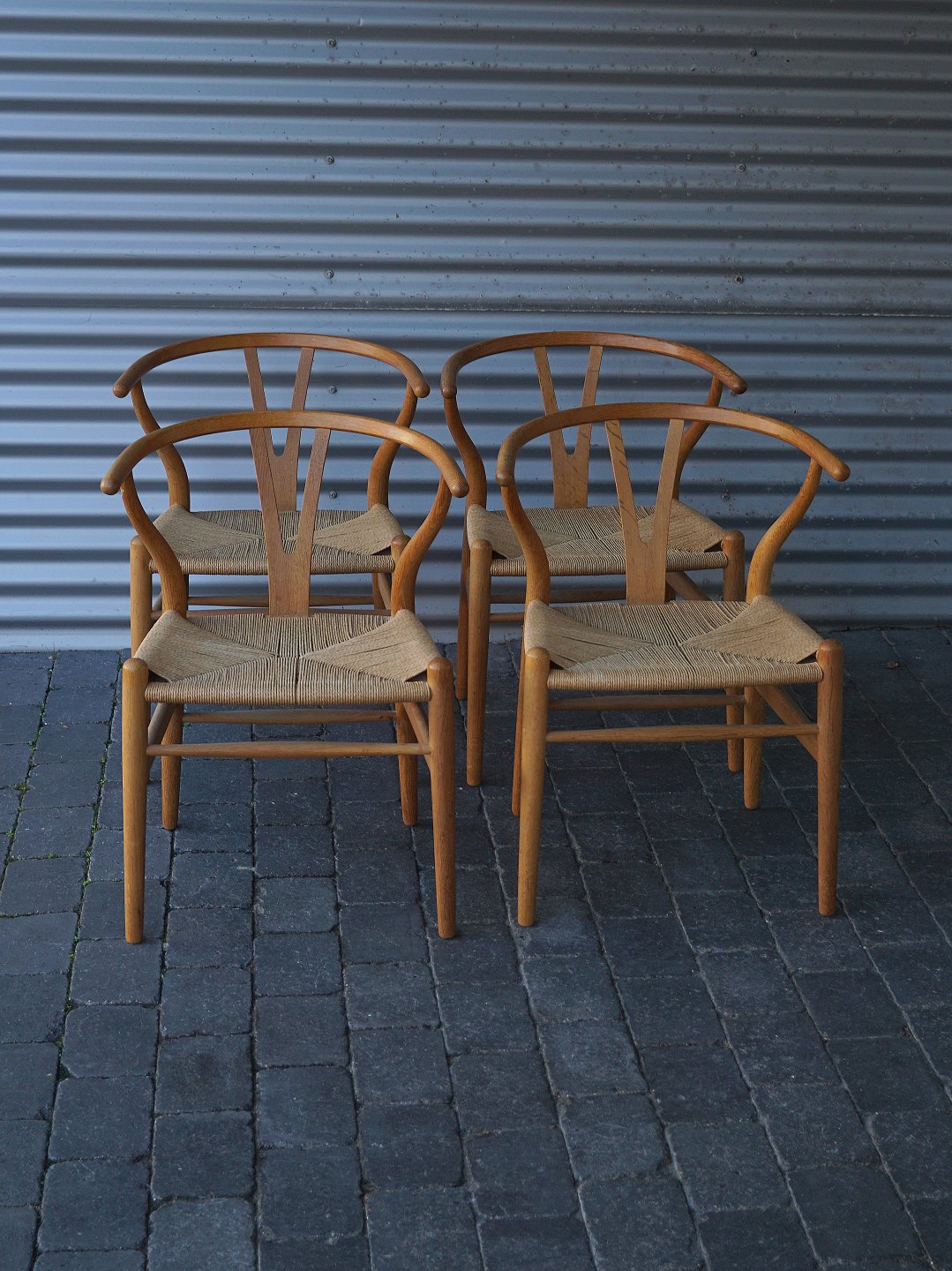 4 stk Hans Jørgen Wegner. CH24 eller Y-stolen, stolen er i eg og designet i 1949. Ryg og armlæn er et stykke træ, der er dampbøjet, sædet er betrukket med ca. 120 m papirgarn