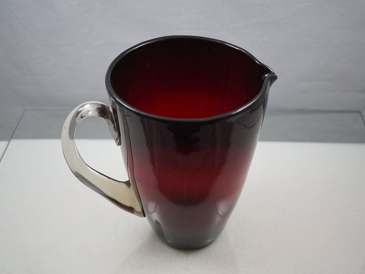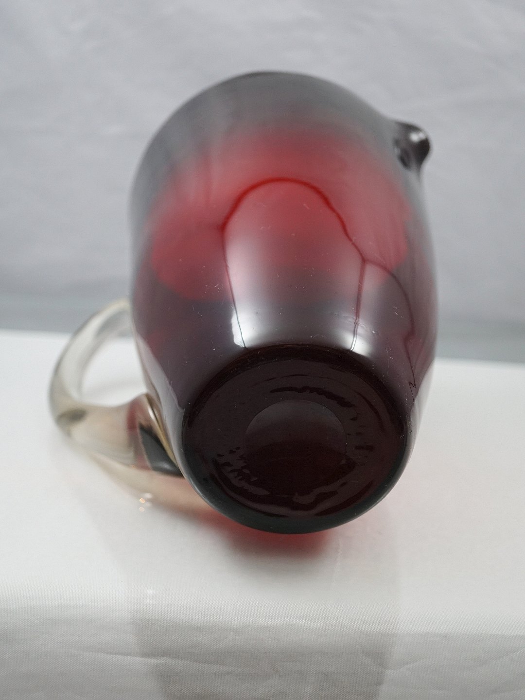 Rød glaskande, med klar hank, kugleslebet i bund