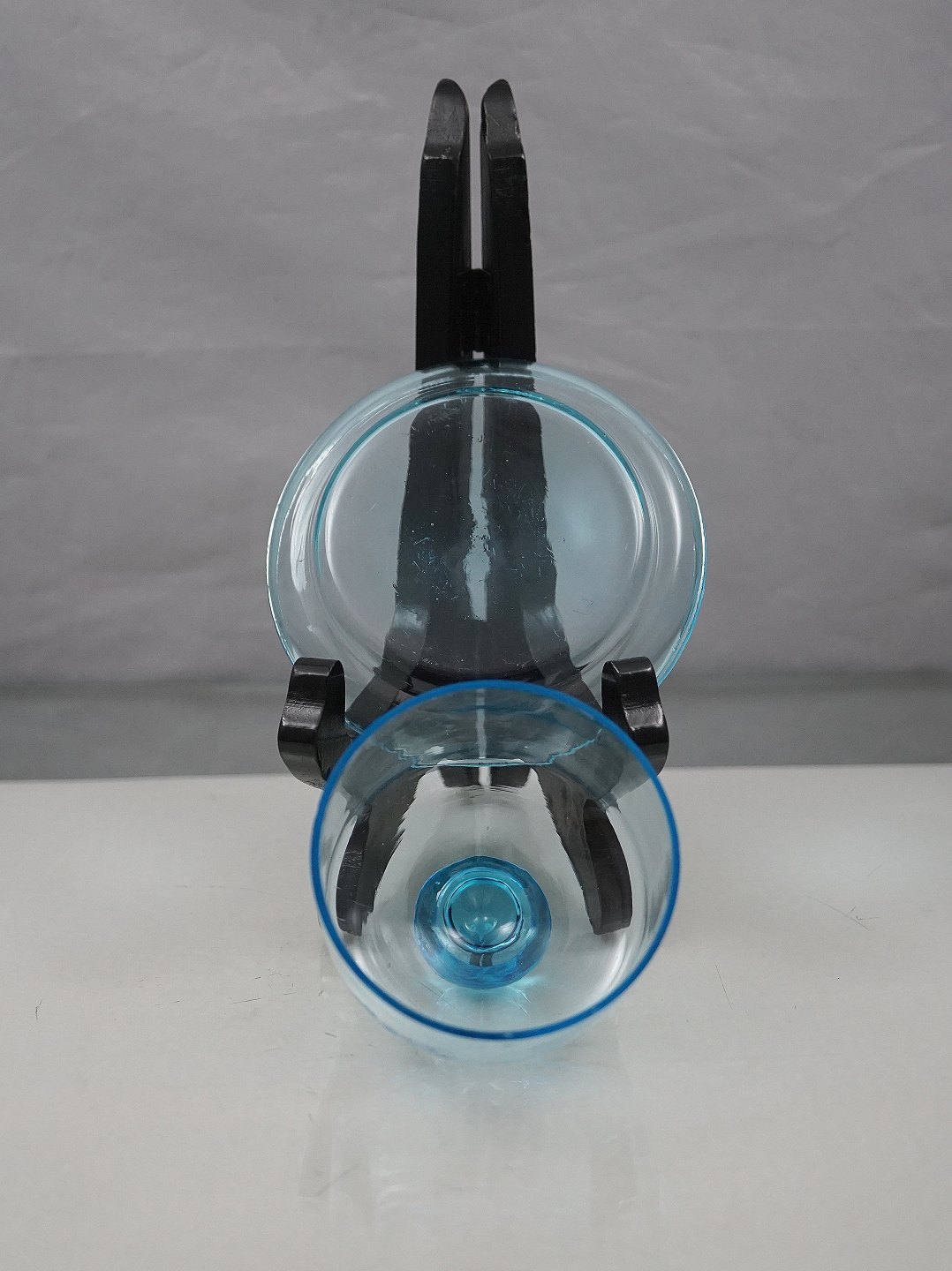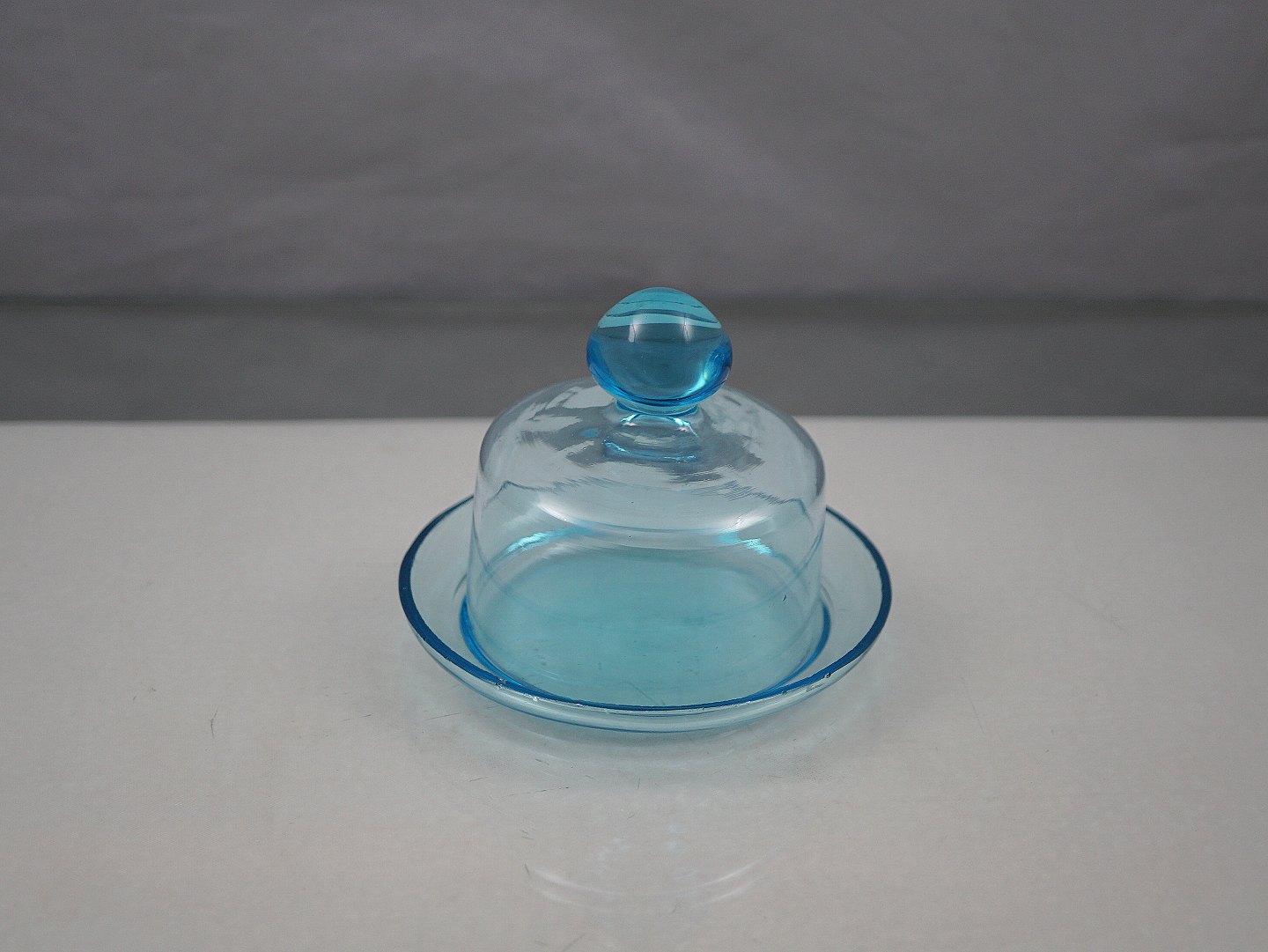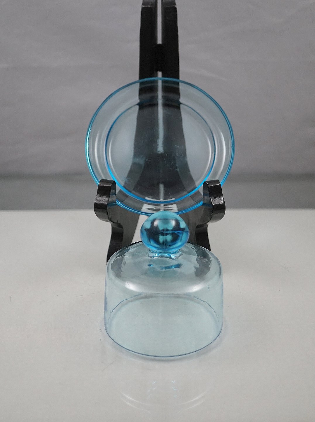 Børne osteklokke. Glat klokke med rund knop på rund bakke med afsprængt rand.