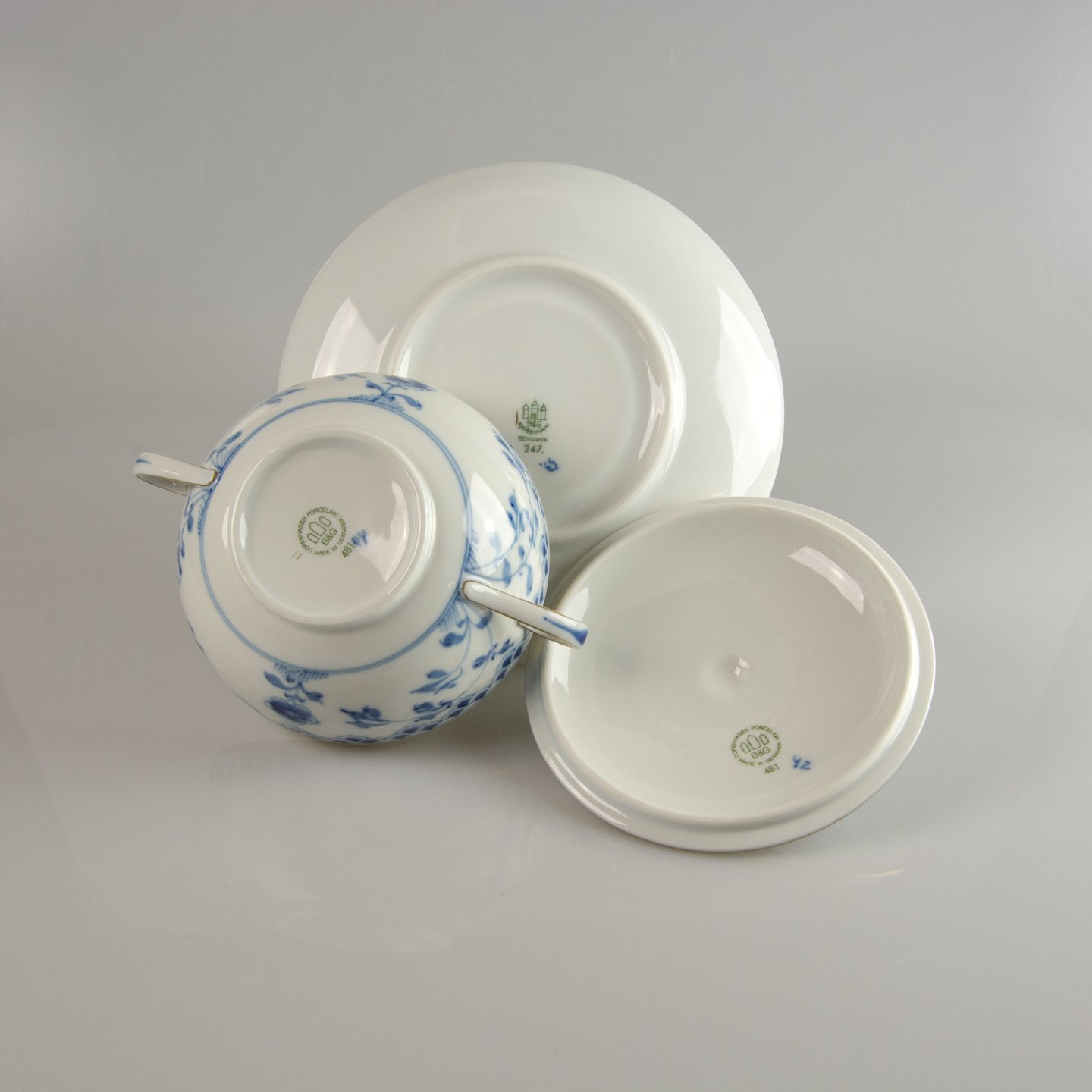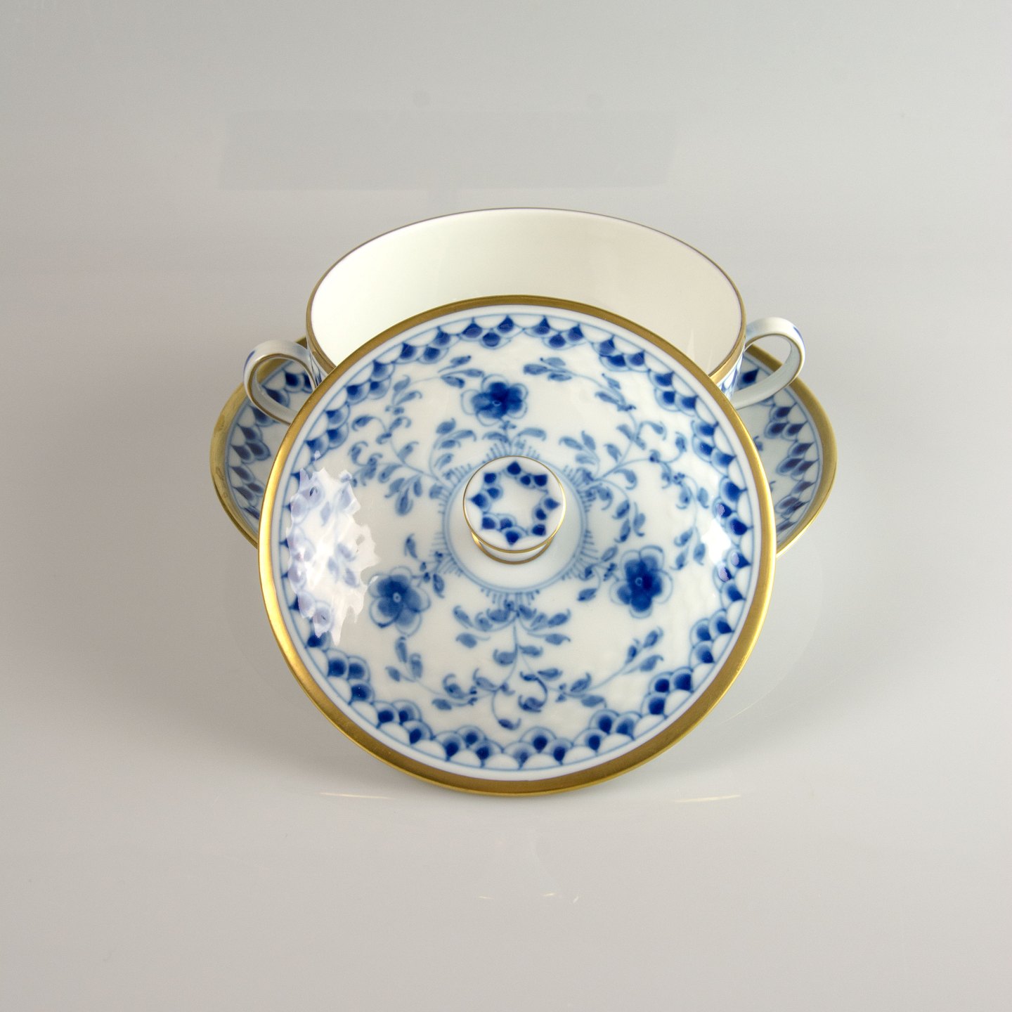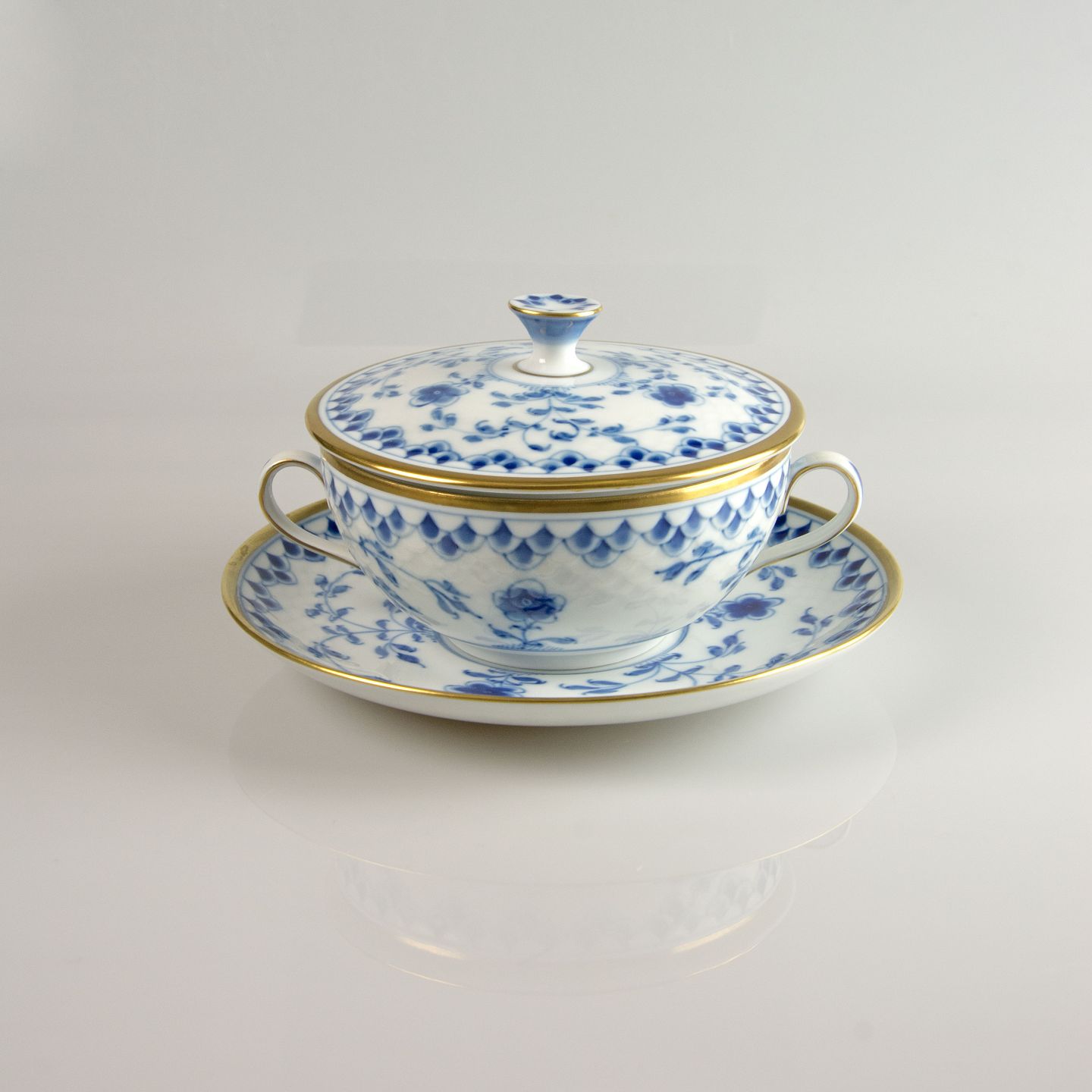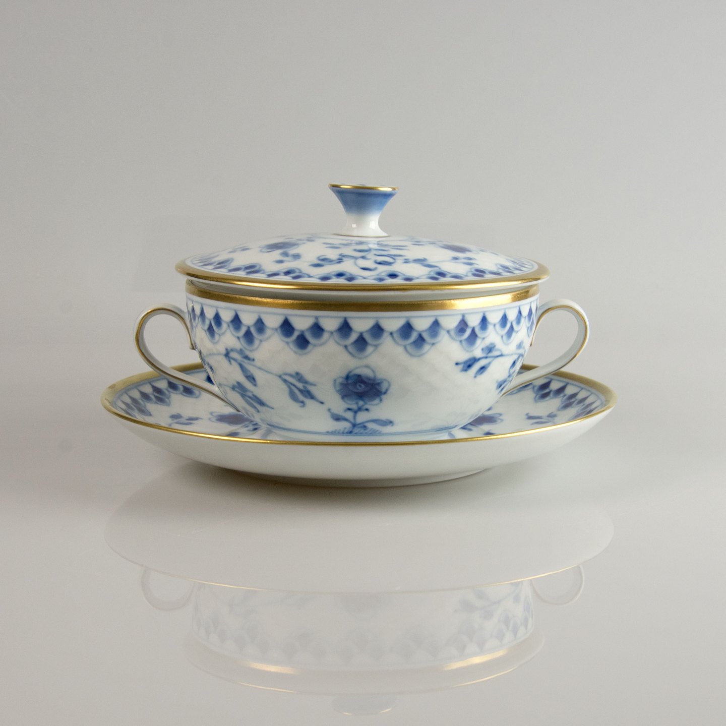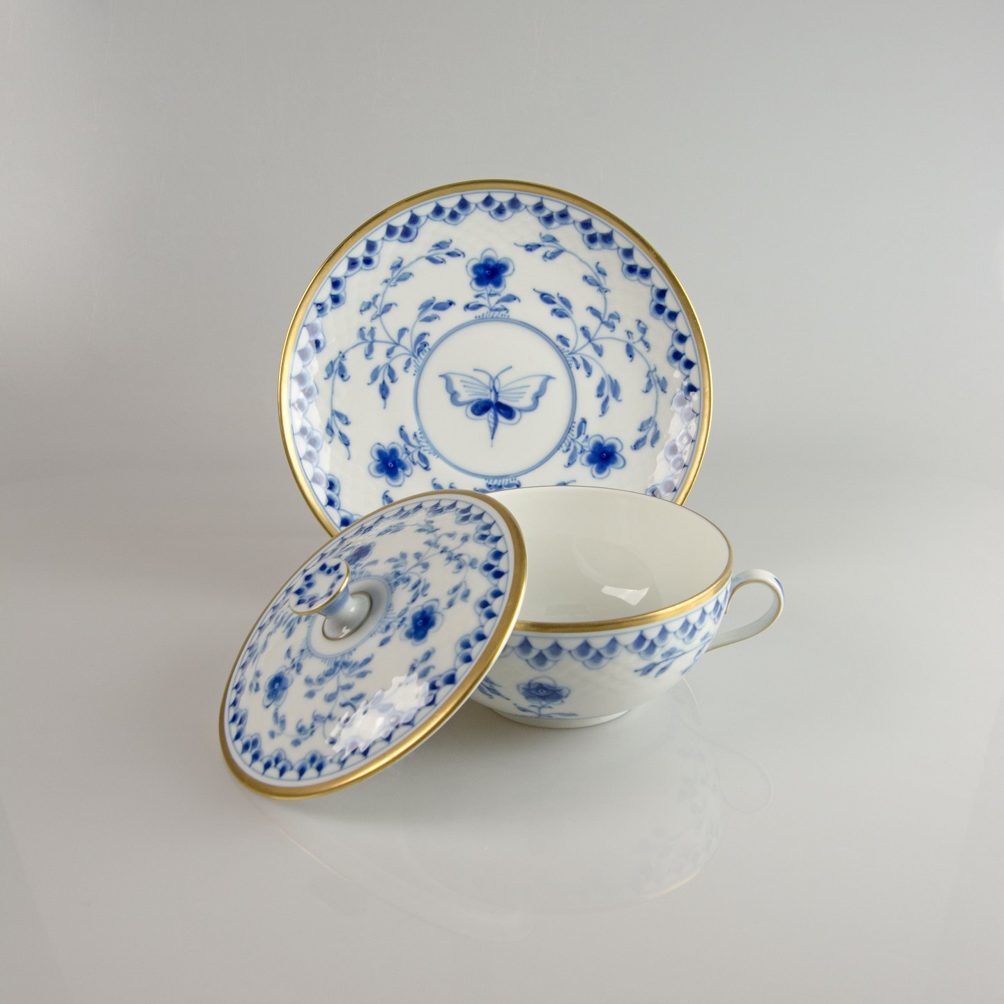 Bouillon med undertallerken fra stellet Dickens Sommerfugl med guldkant nr. 481 + nr. 247
