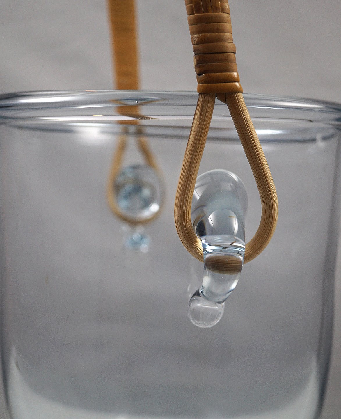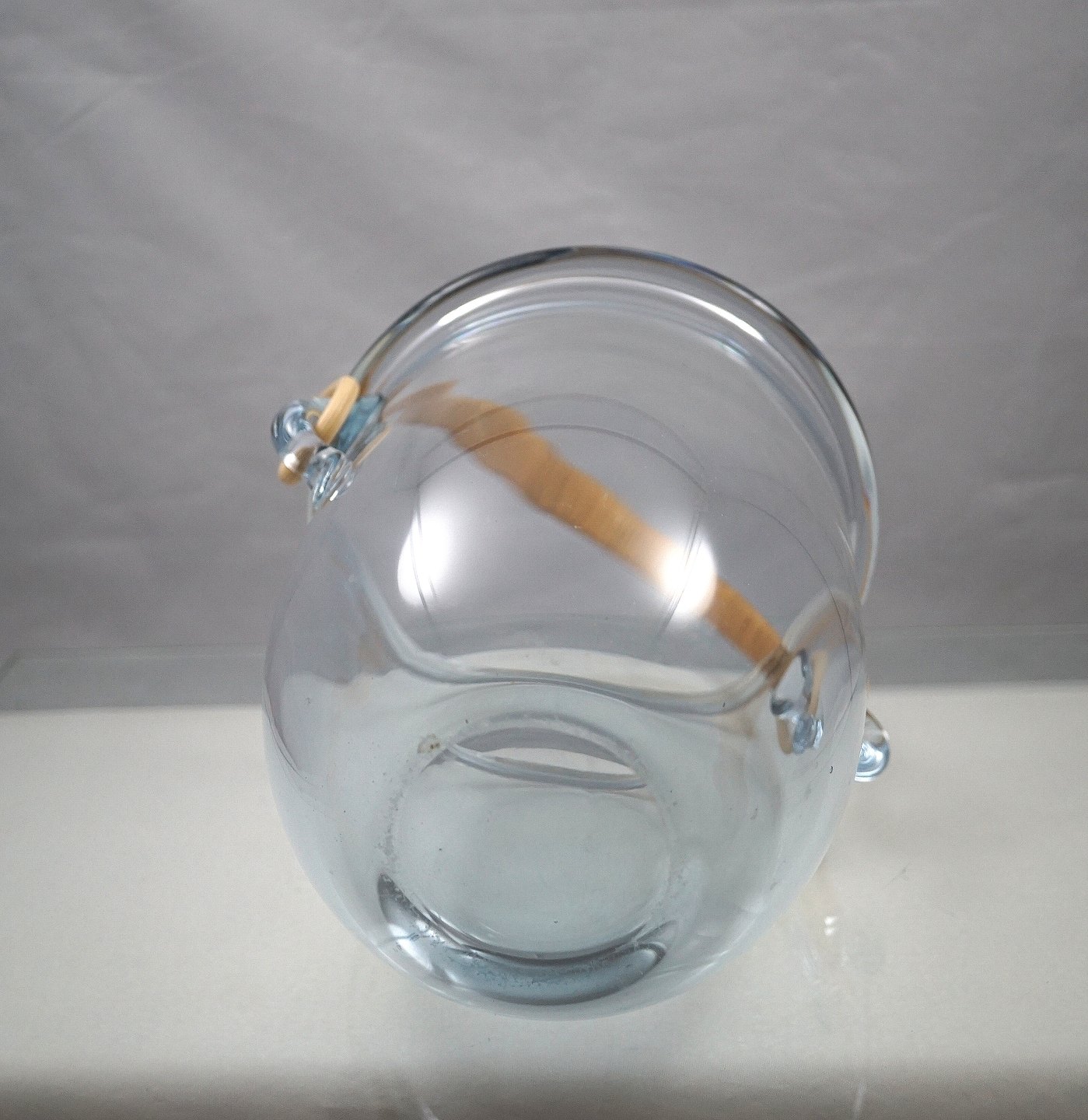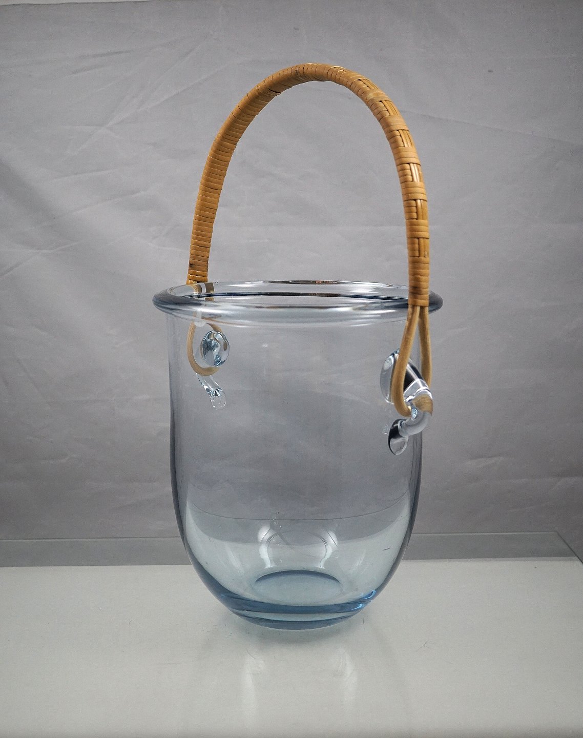 Holmegaard Glasværk, Champagnekøler, i lyst blålig glas og original bast hank. Champagnekøleren er mundblæst med påsatte hanke og udadbuet kant