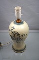 Bordlampe i kunstfajance. Lampen er svagt grønlig med mørkegrønne striber, dekorationen er en blomst i et fad. Nr. 49/121