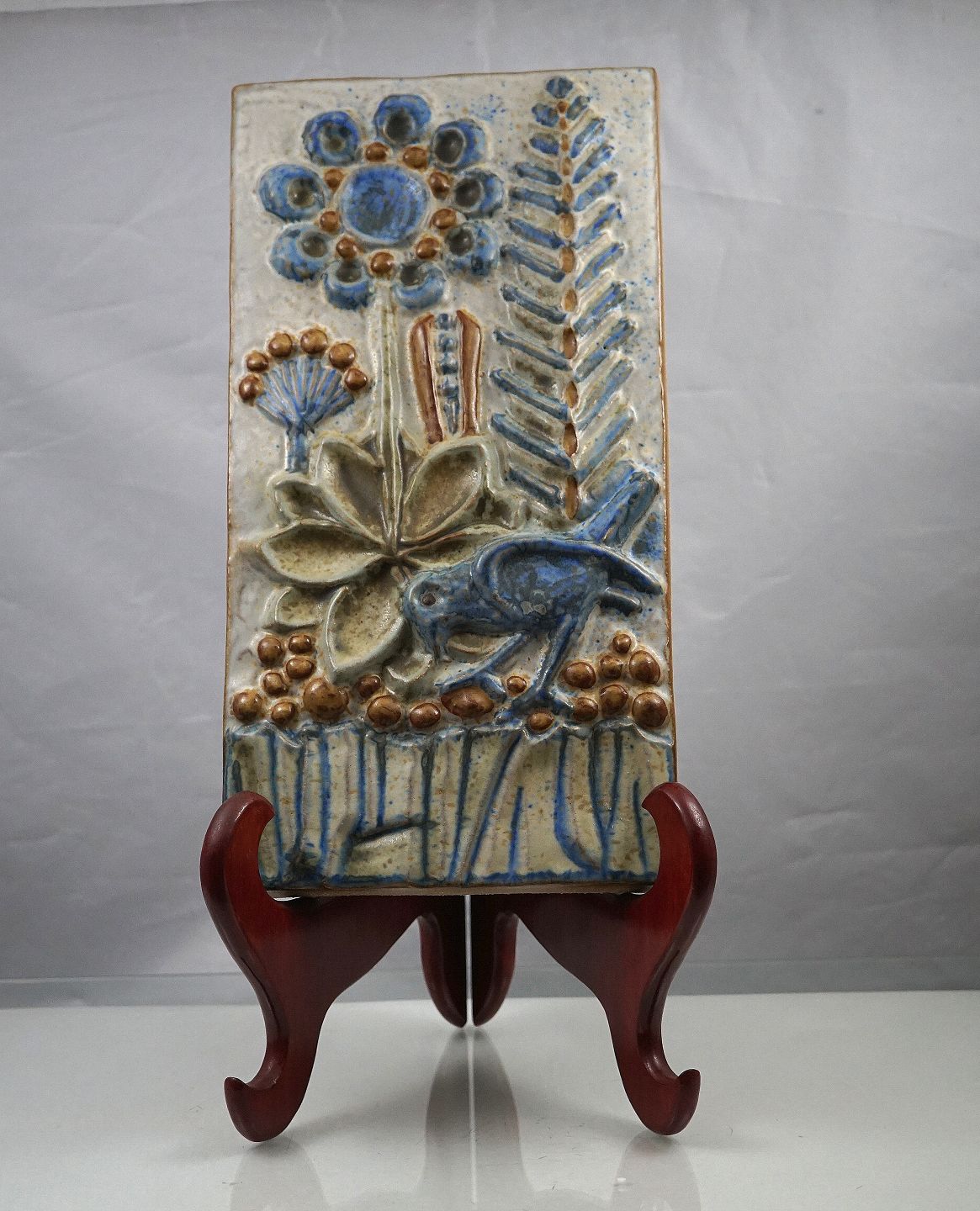Bornholmsk relief af Michael Andersen, signeret MS, nr. 6216. Relieffet forestiller fugl og blomster, farverne er gennemgående blå