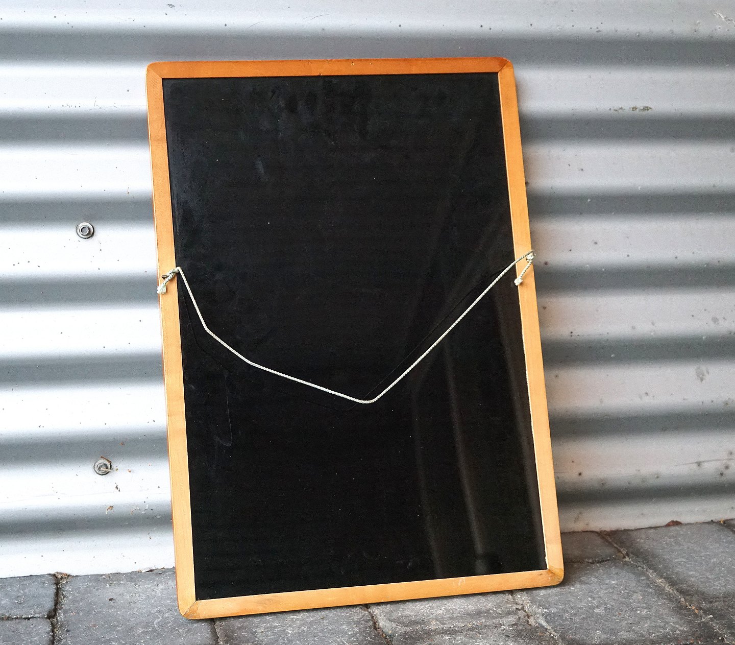 Spejl med detaljer i teaktræsrammen. Spejlet har en sort, helt blank bagside