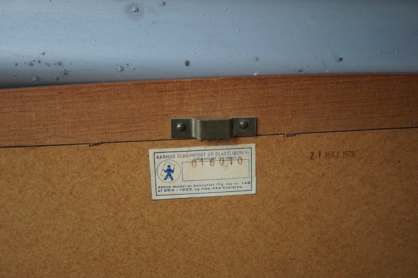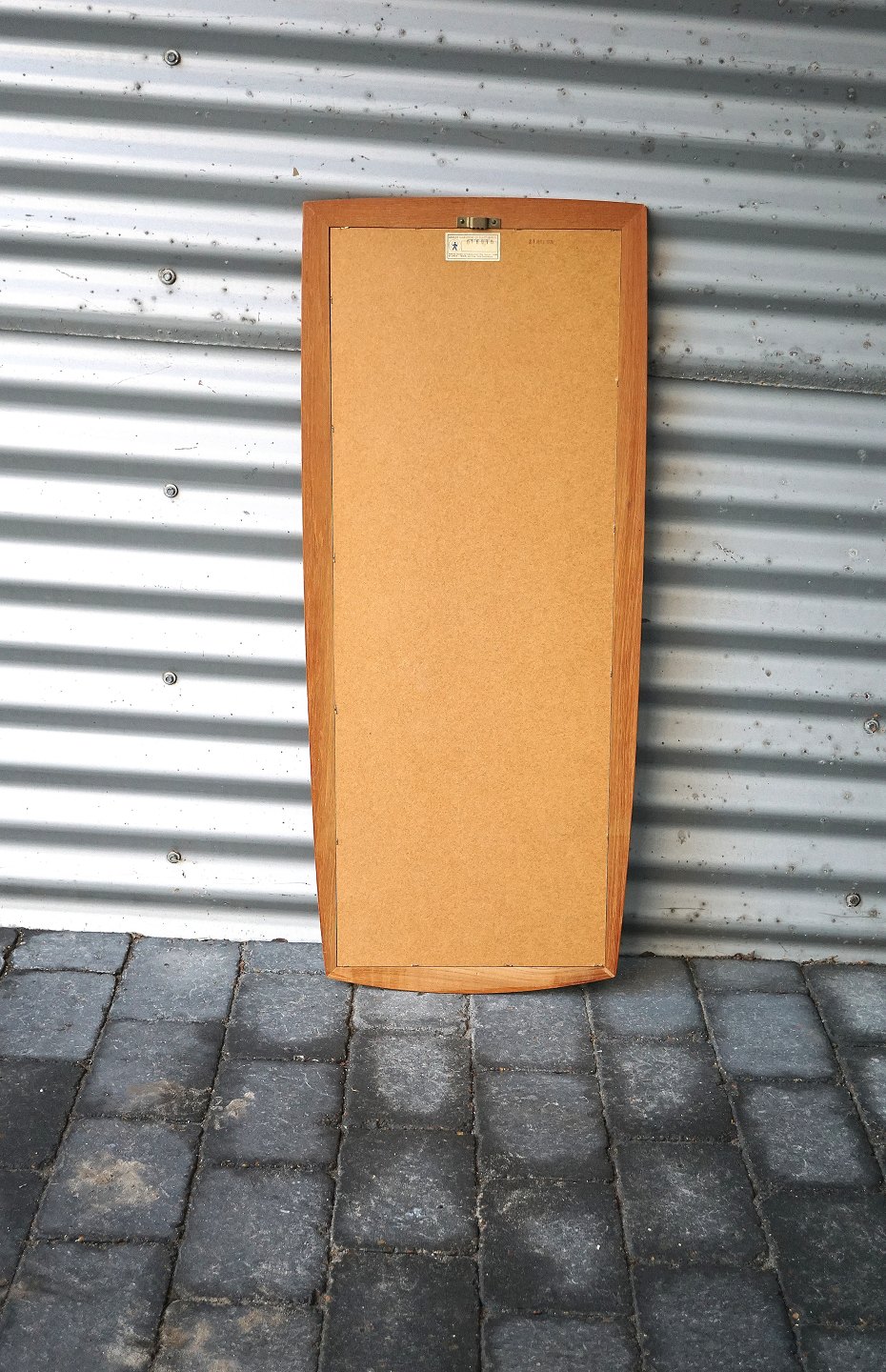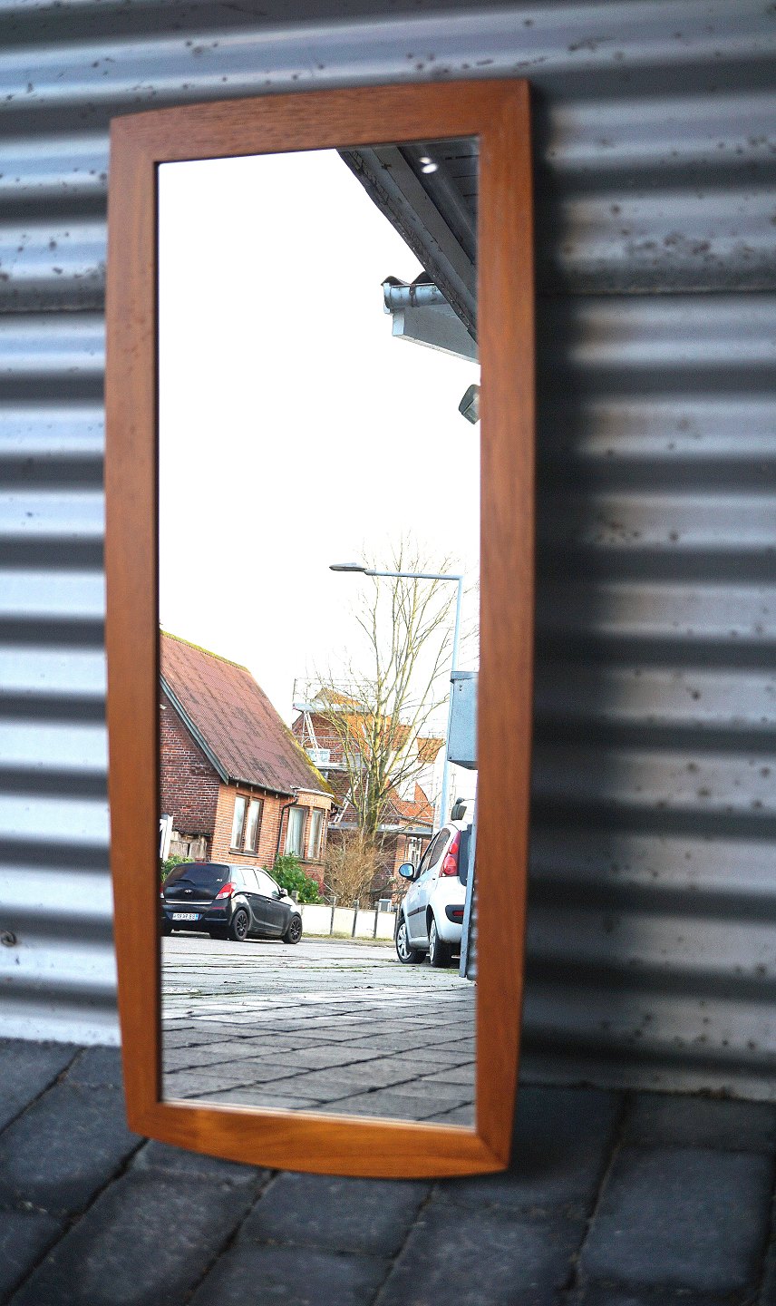Entre spejl med teaktræsramme. Spejlet kommer fra Århus Glasimport og sliberi. Der er indlagt ophæng