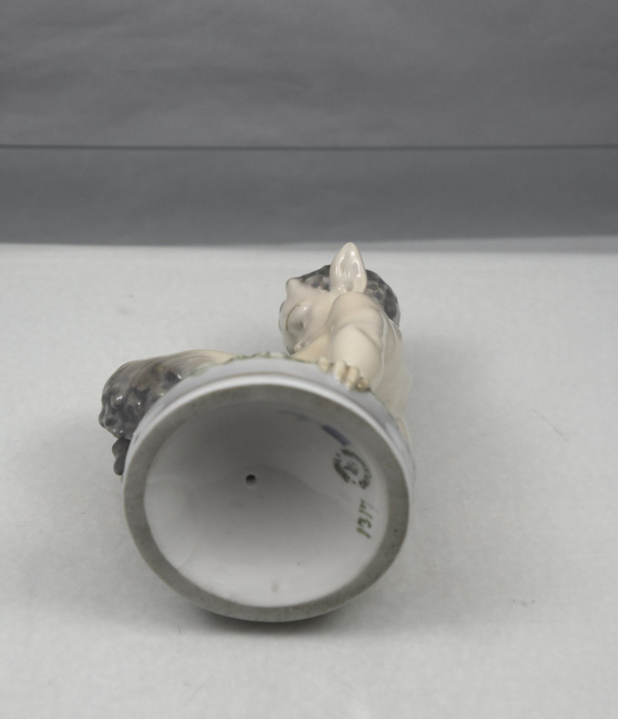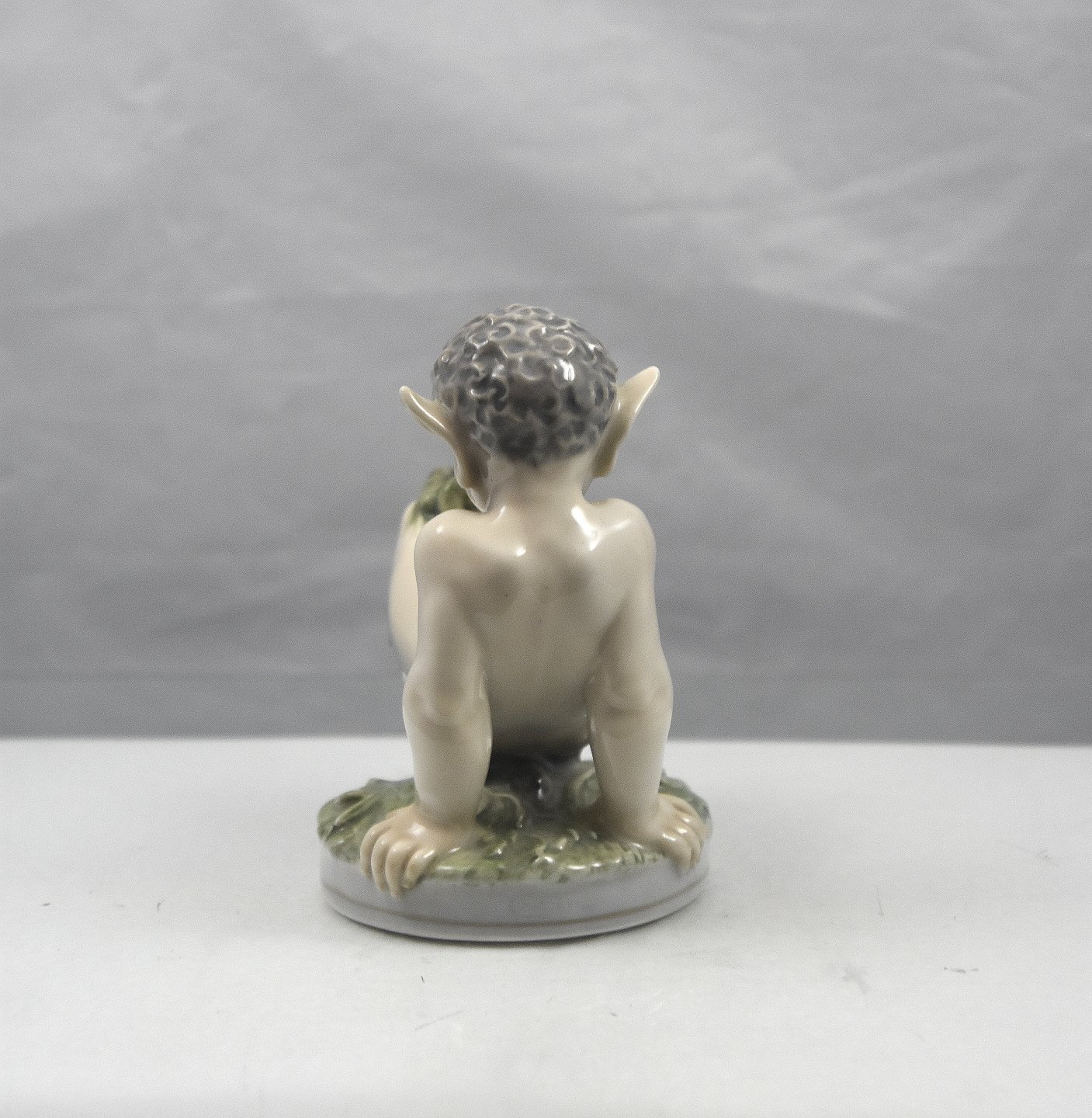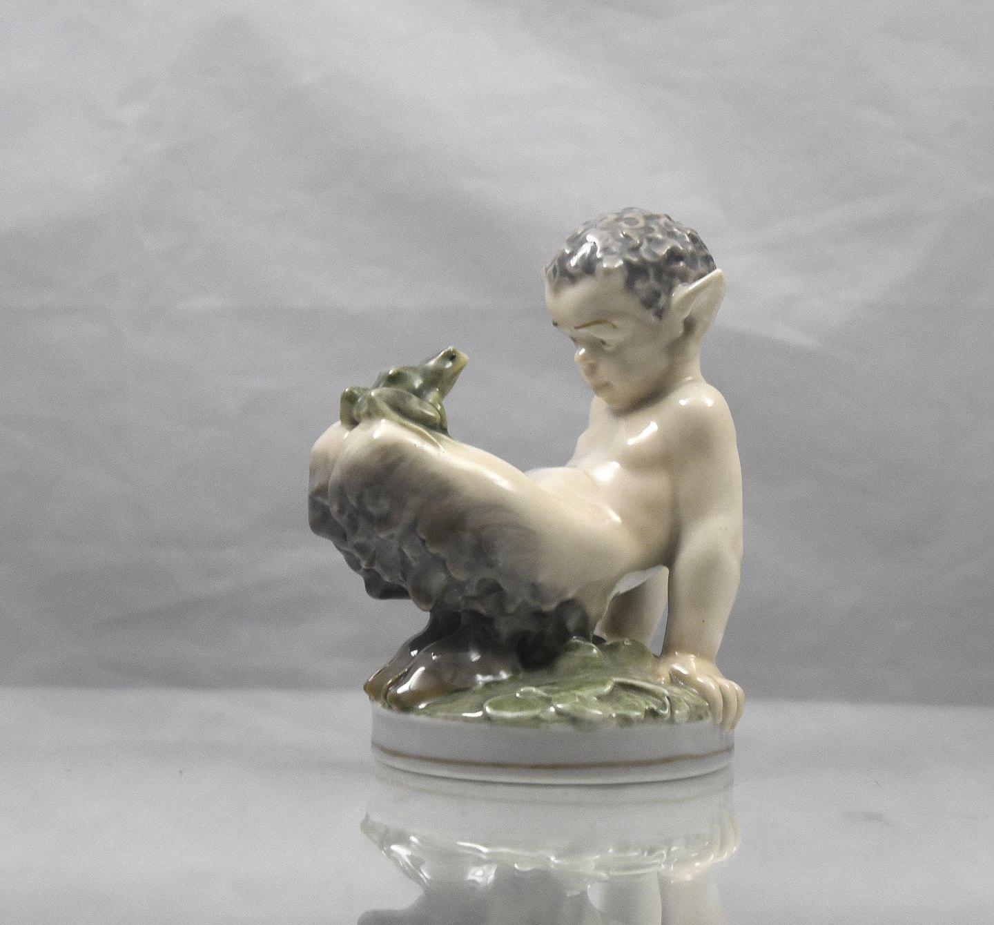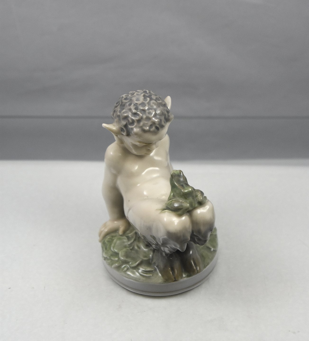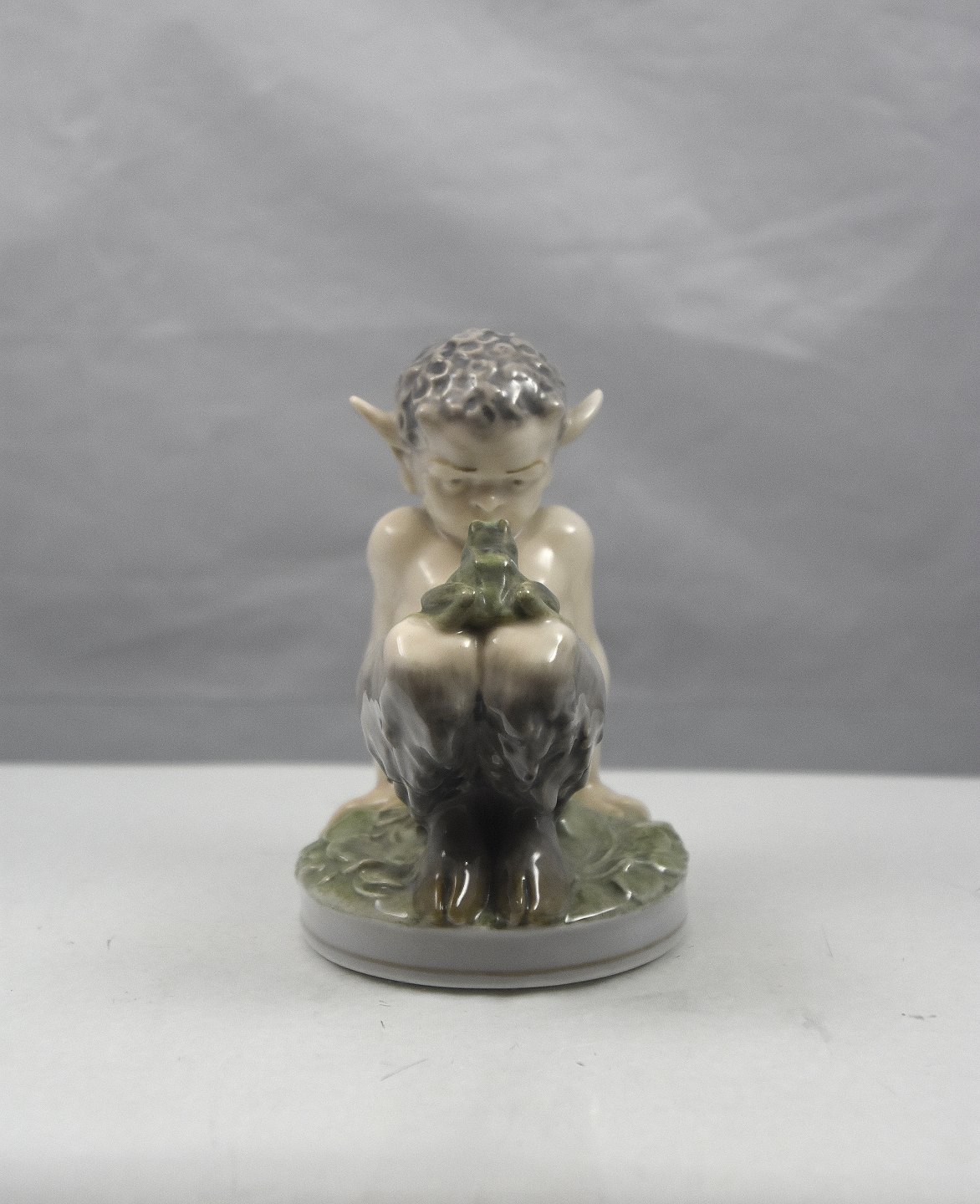 Royal Copenhagen. Faun med frø, skrevet nr. 1317, men er 1713, så det er gået for hurtig for maleren. Faunen sidder på en græstop. Faunen er i fin stand. 1. sortering