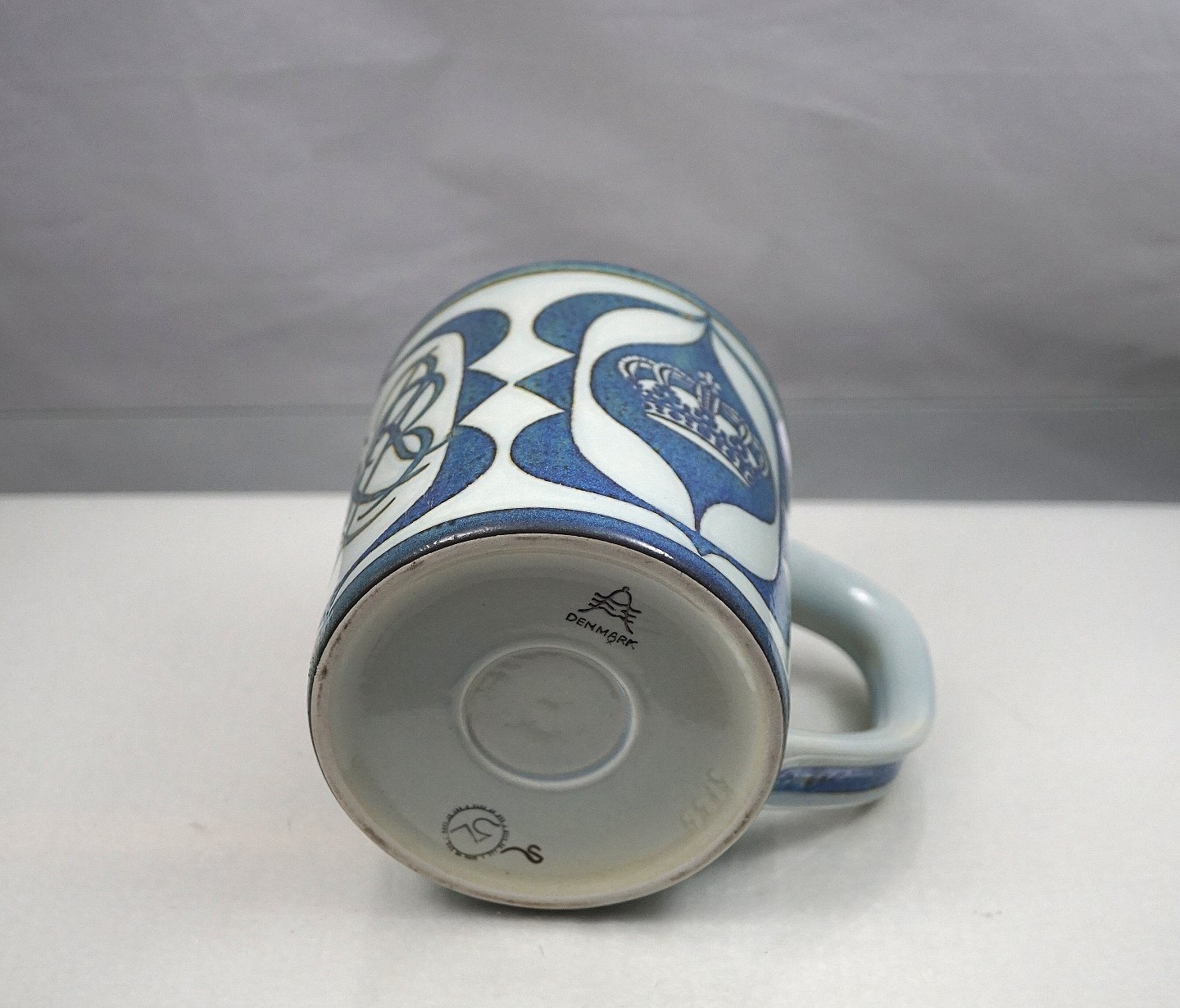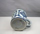 Hvidt krus fajance med blå dekoration og sort monogram