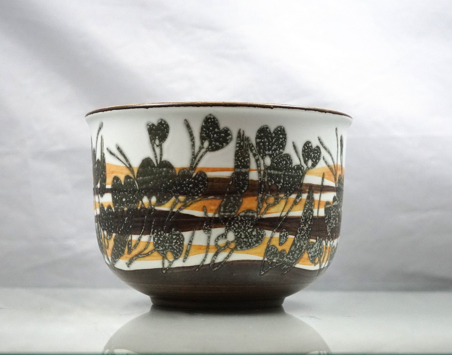 Royal Copenhagen. Fajance urtepotte, nr. 963/3758. Urtepotten er hvid og der er malet fantasi blomster på den, i brunlige og gullige farver