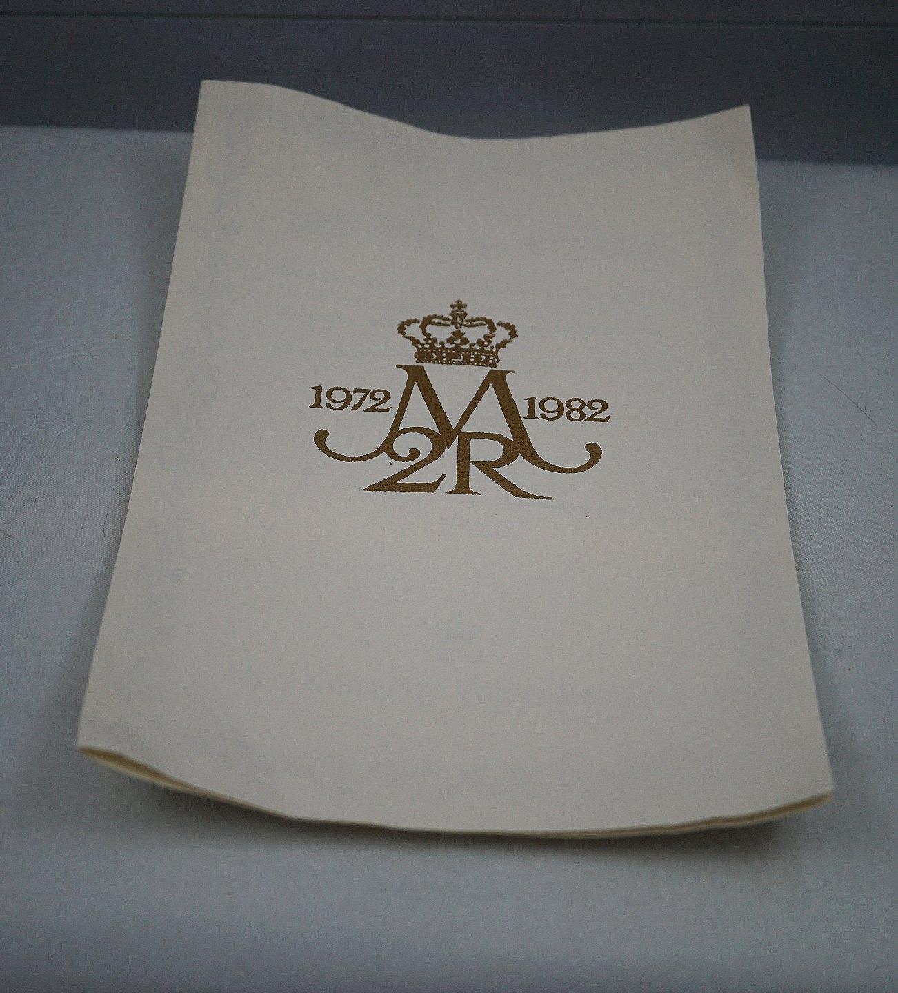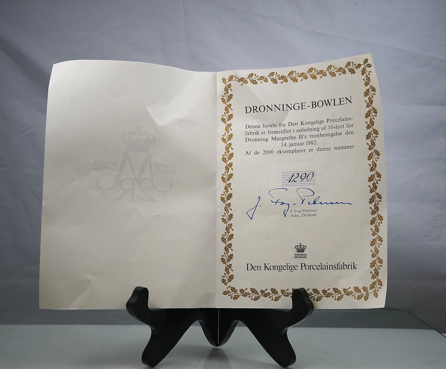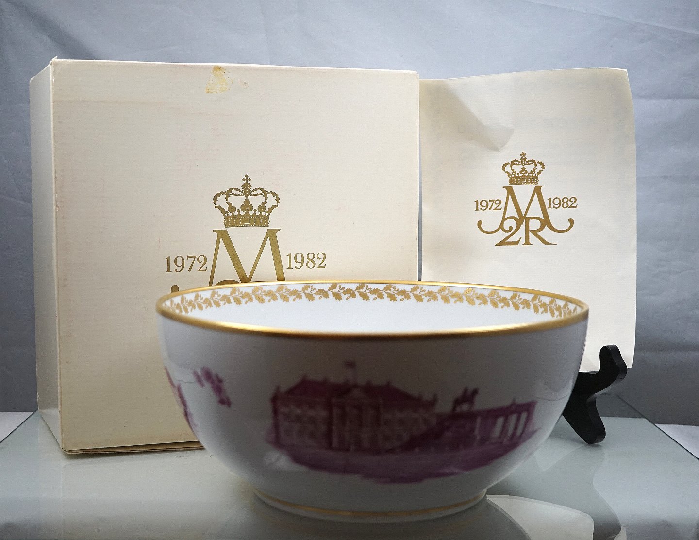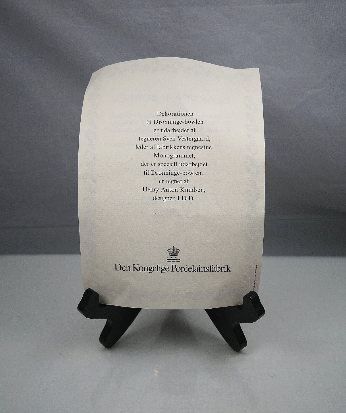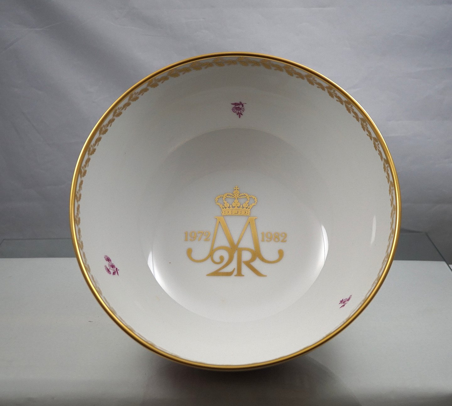 Skålen har en guldkantog er fremstillet i anledning af Dronning Margrethes 10 års tronbestigelse den 14 januar 1982.