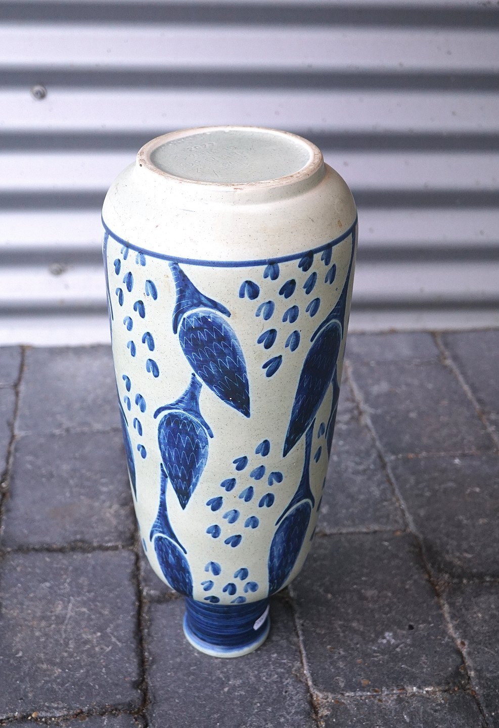 Søholm, Bornholm. Vase, nr. 2077, der er dekoreret med stiliseret lupiner, vasen er hvid og dekorationen er holdt i en blå farve. Signeret EJ, ca. 1960