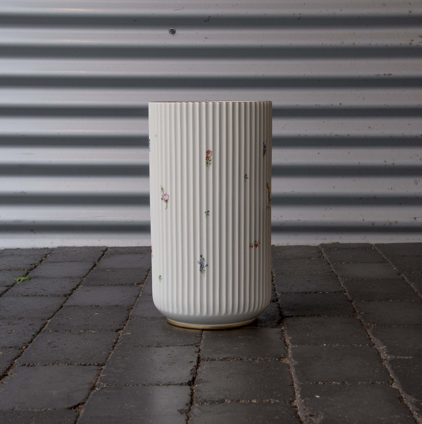 Lyngby vase i riflet porcelæn med guldkant og blomstermotiv nr. 4037