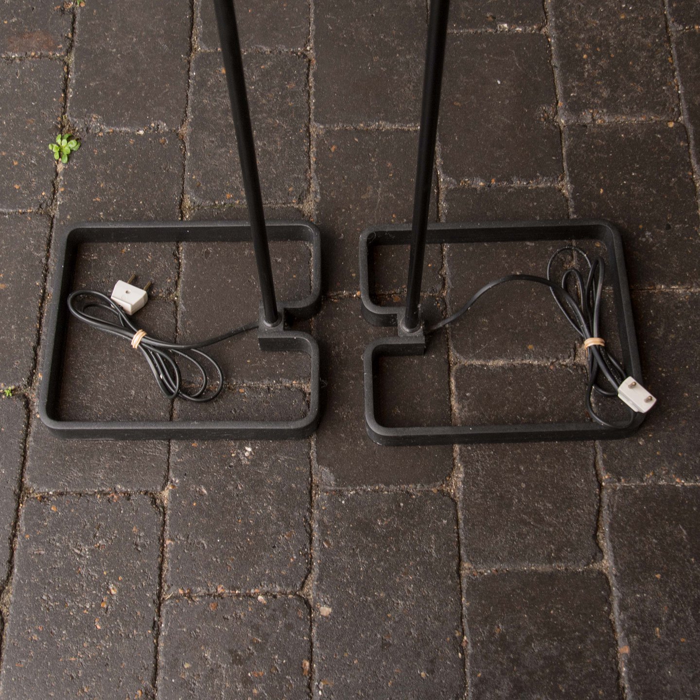 Brunlakeret aluminiumskærm på sortlakeret metalfod. Lamperne tændes i toppen.