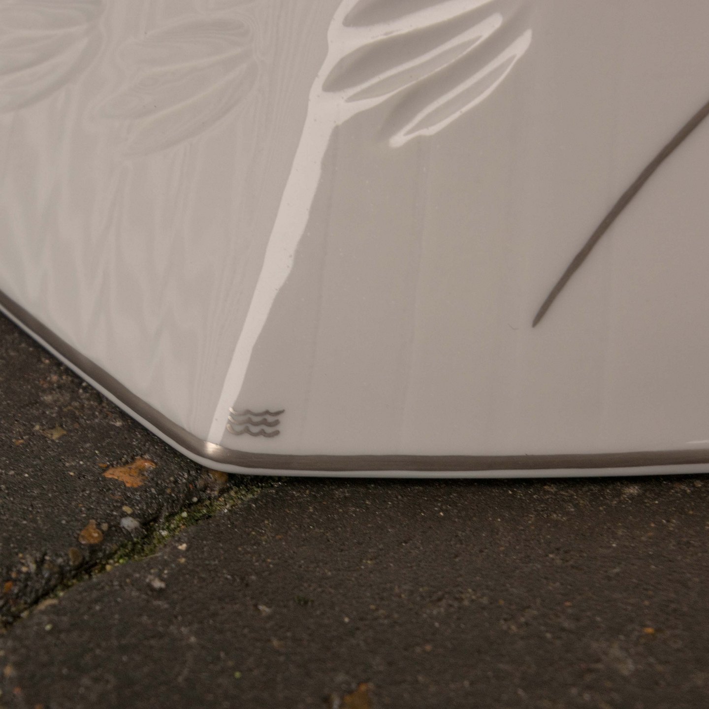 Stor Luciana pendel i hvidt porcelæn med mønster og sølvkant