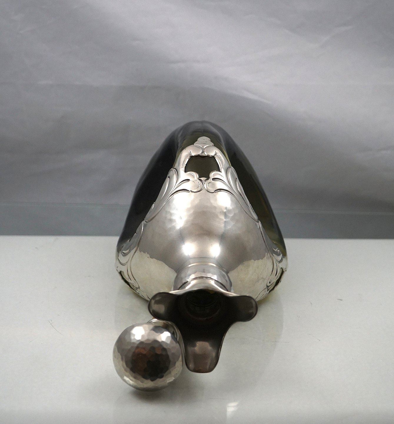 Ældre 3-kantet flaske med tinbesætning på skuldrene og prop af kork og tin, ca 1920 Dansk