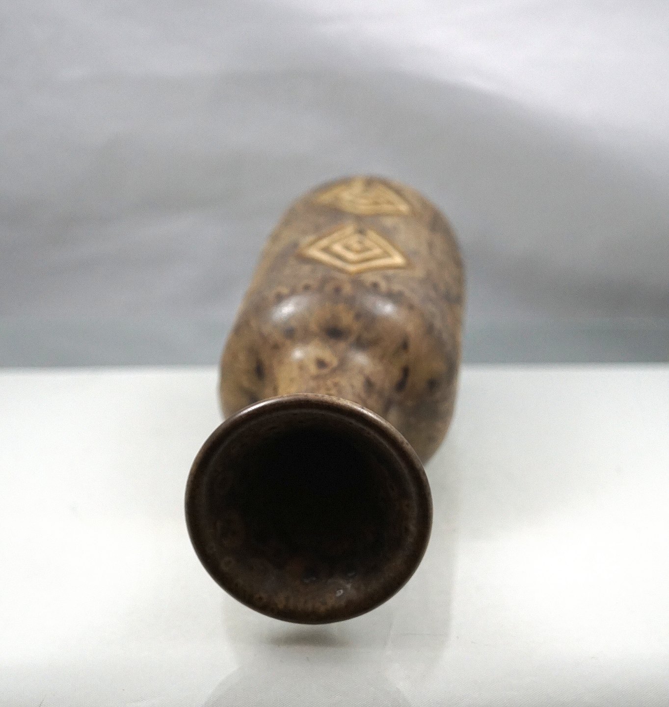 Løvemose Brun keramik vase, med brunt glasur, dekoreret med romber og vasen har udsvejet hals