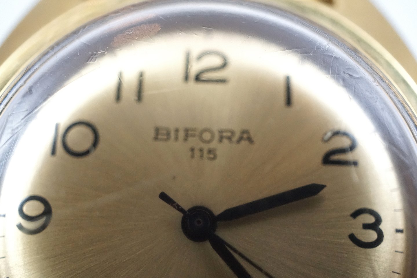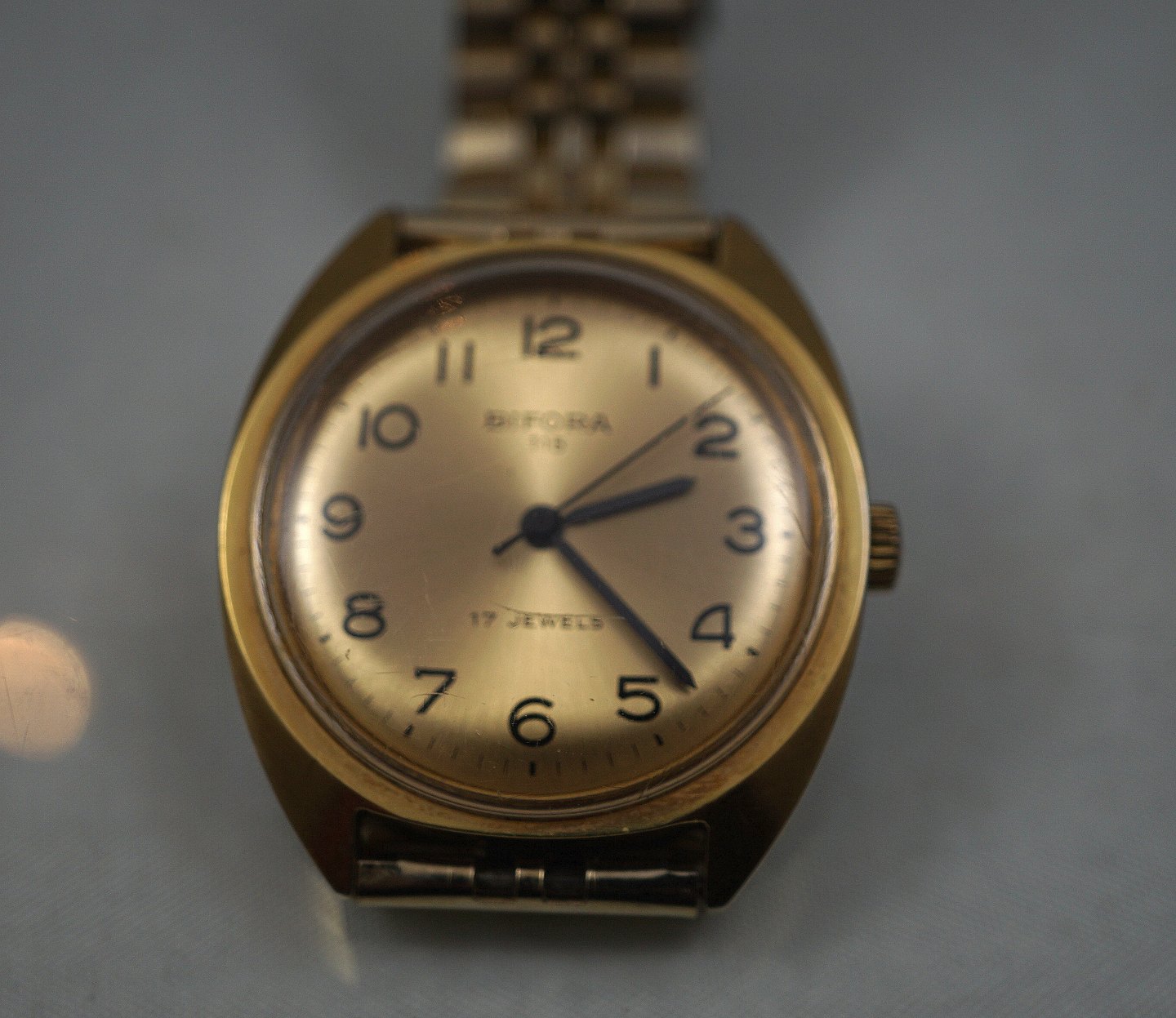 Bifora 115, armbåndsur, 17 Jewels. Uret er med opdrag og forgyldt. Kæden kan reguleres i omkreds