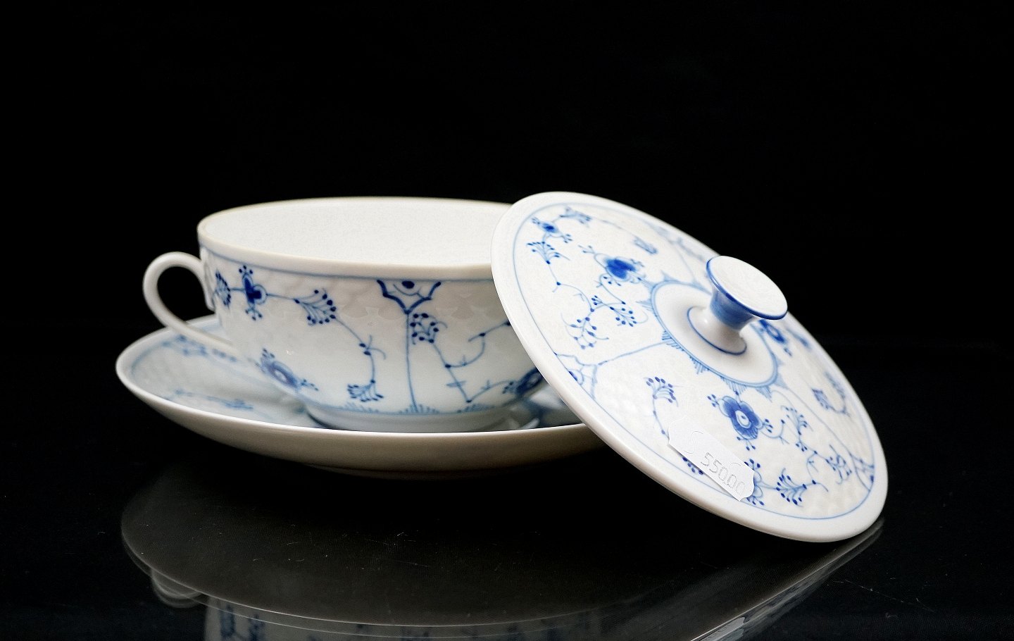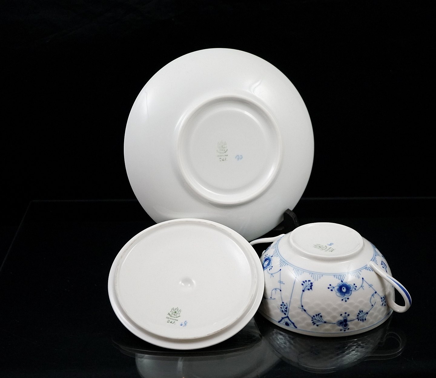 Bing & Grøndahl. Boullionkop med låg og underkop, nr. 247. Det blåmalede stel er Bing & Grøndahls