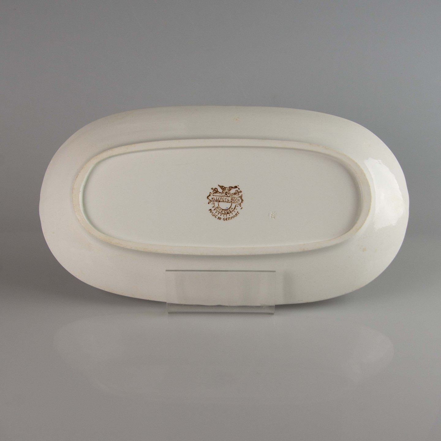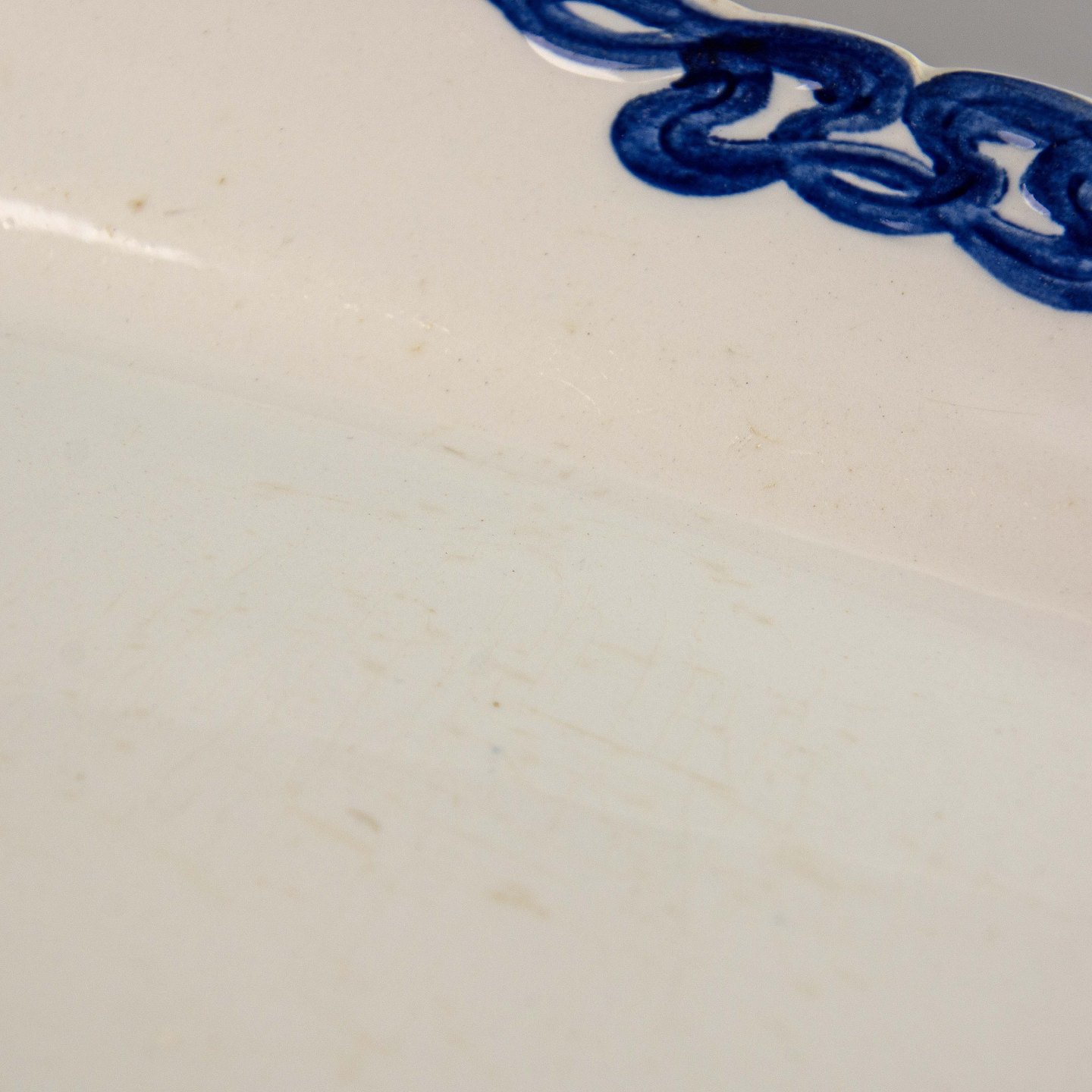 Fad i hvid fajance med dekoration af blå abstrakt mønster langs kanten.