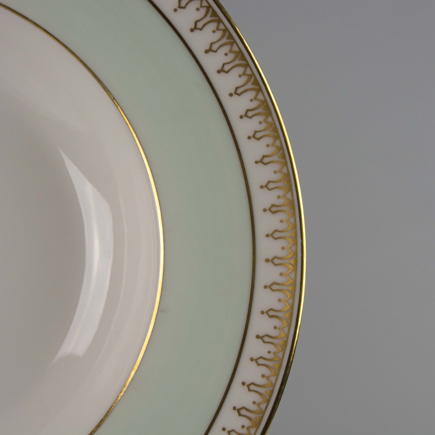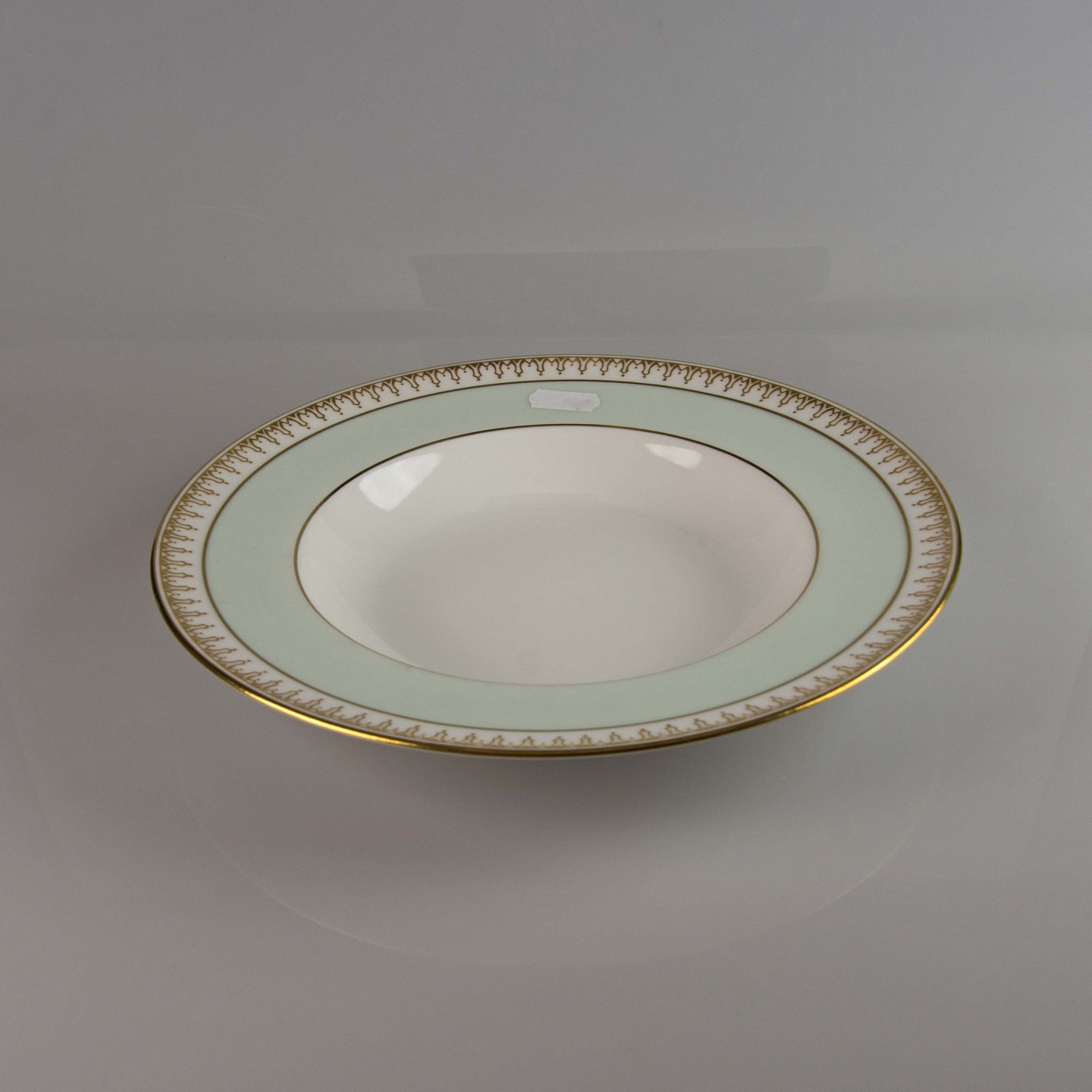 Tallerken i hvidt porcelæn med lysegrøn kant og gylden dekoration