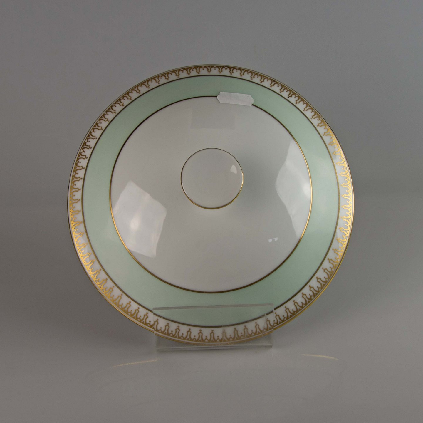 Lågfad i hvidt porcelæn med lysegrøn kant og gylden dekoration