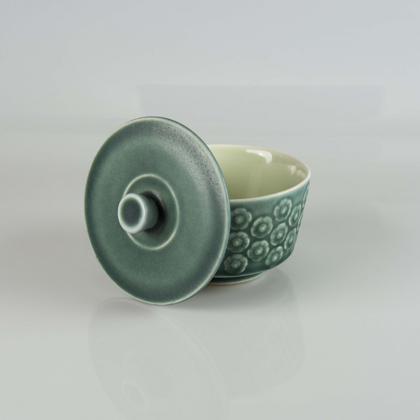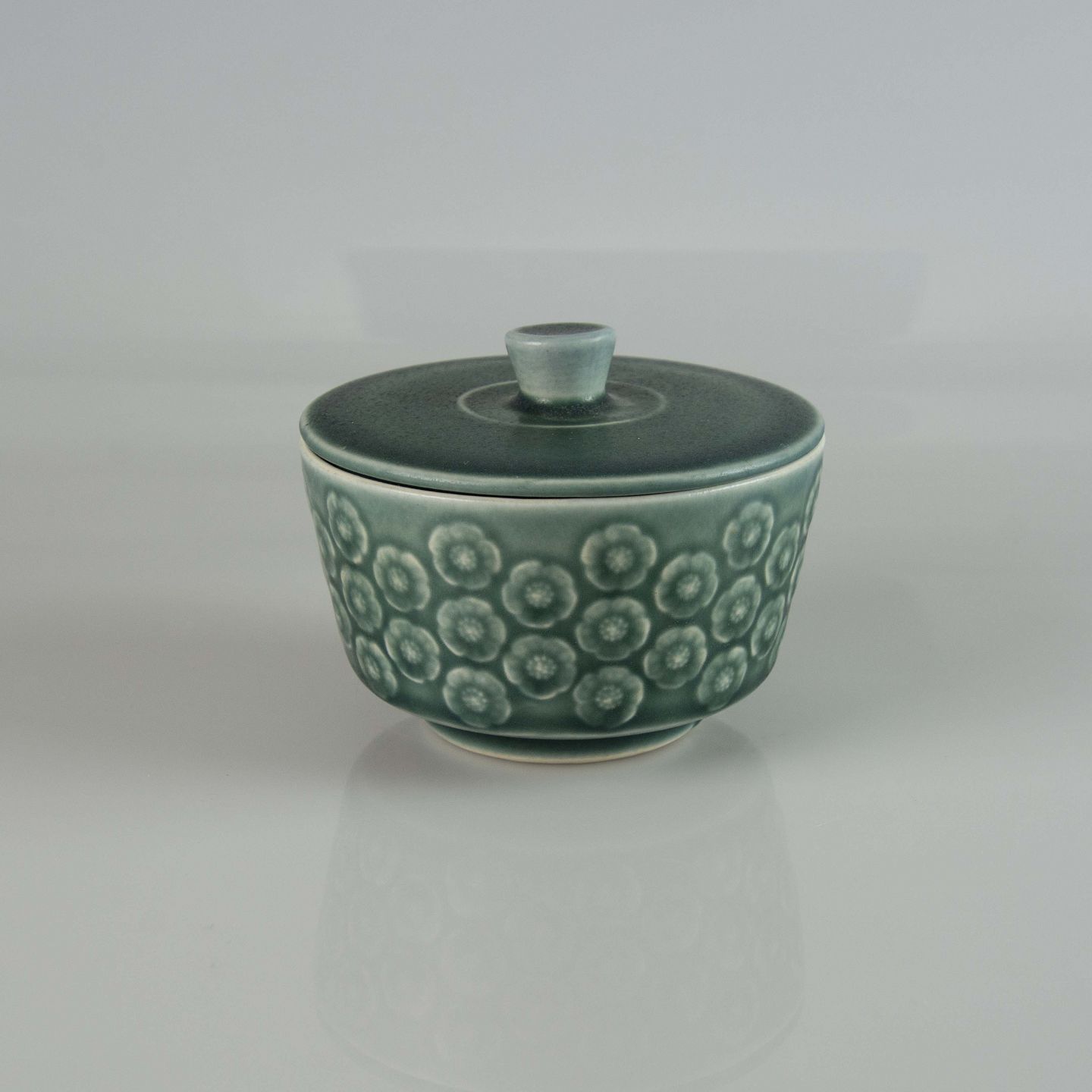 Lågkrukke i blågrøn stentøj med blomster motiver.