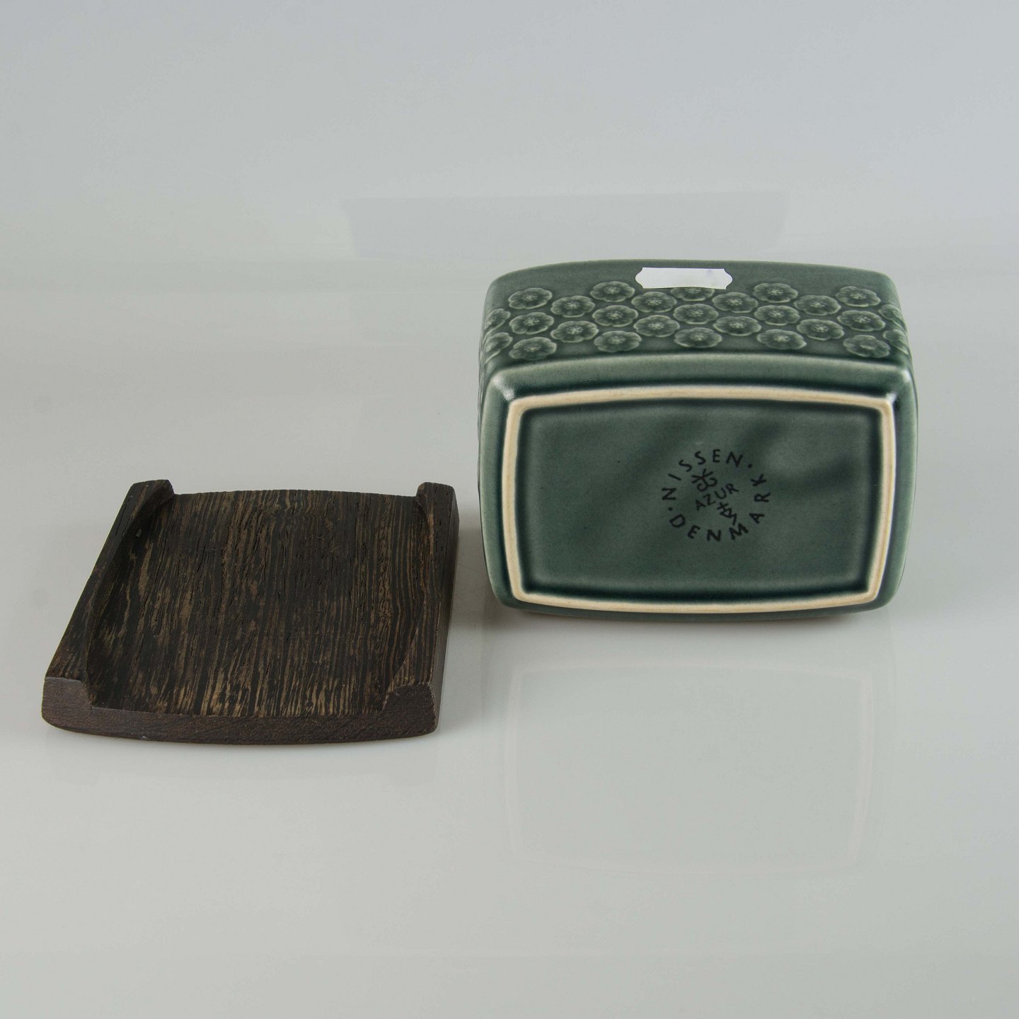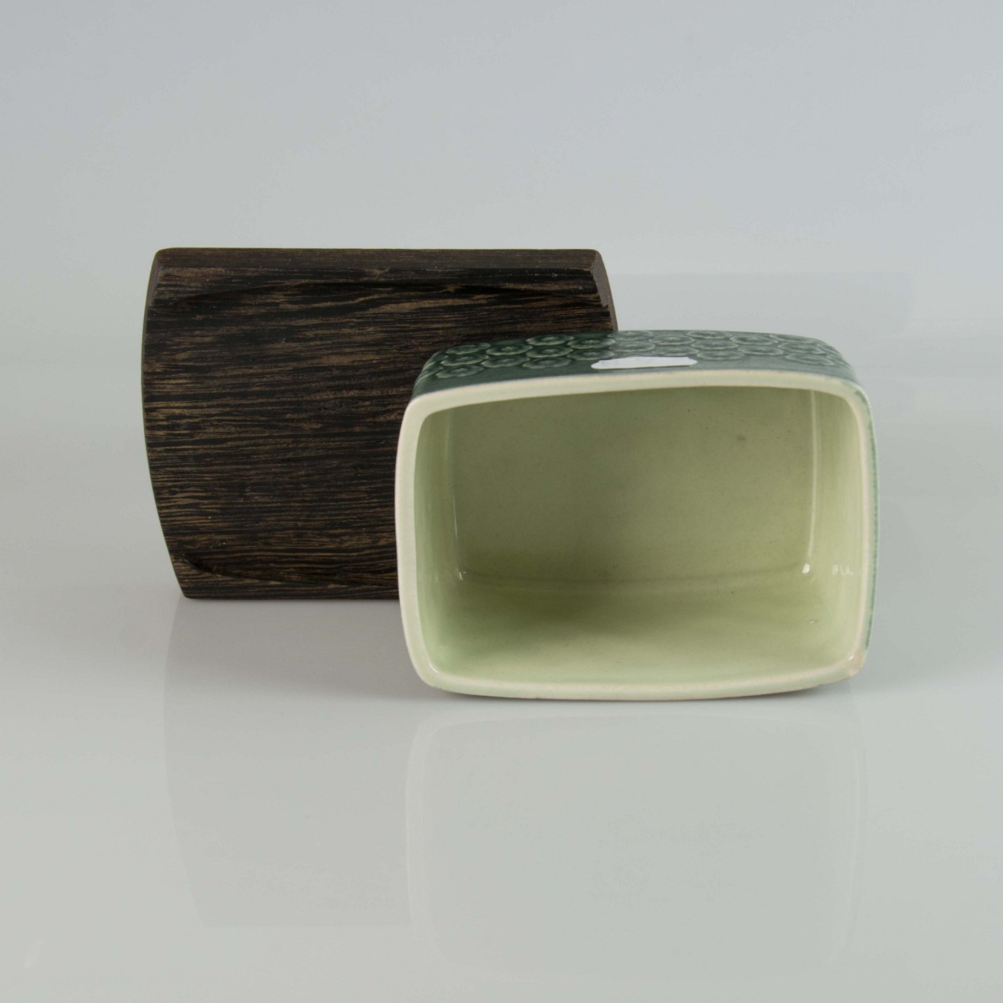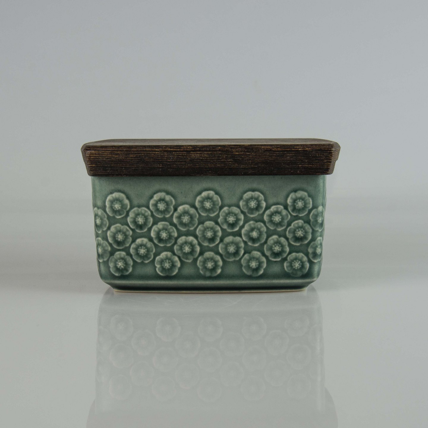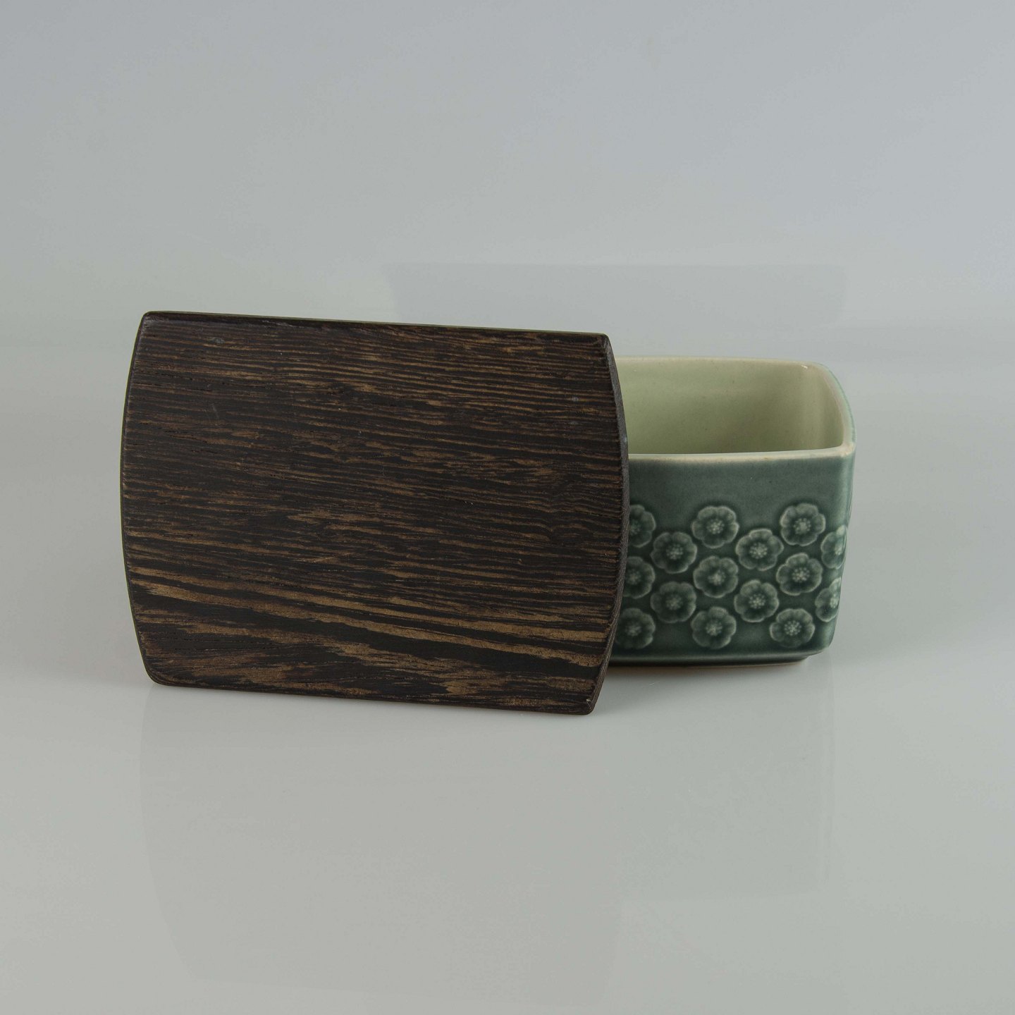 Skål i blågrøn stentøj med blomster motiver og låg i træ.