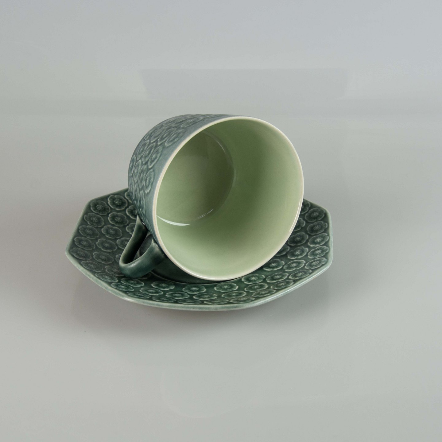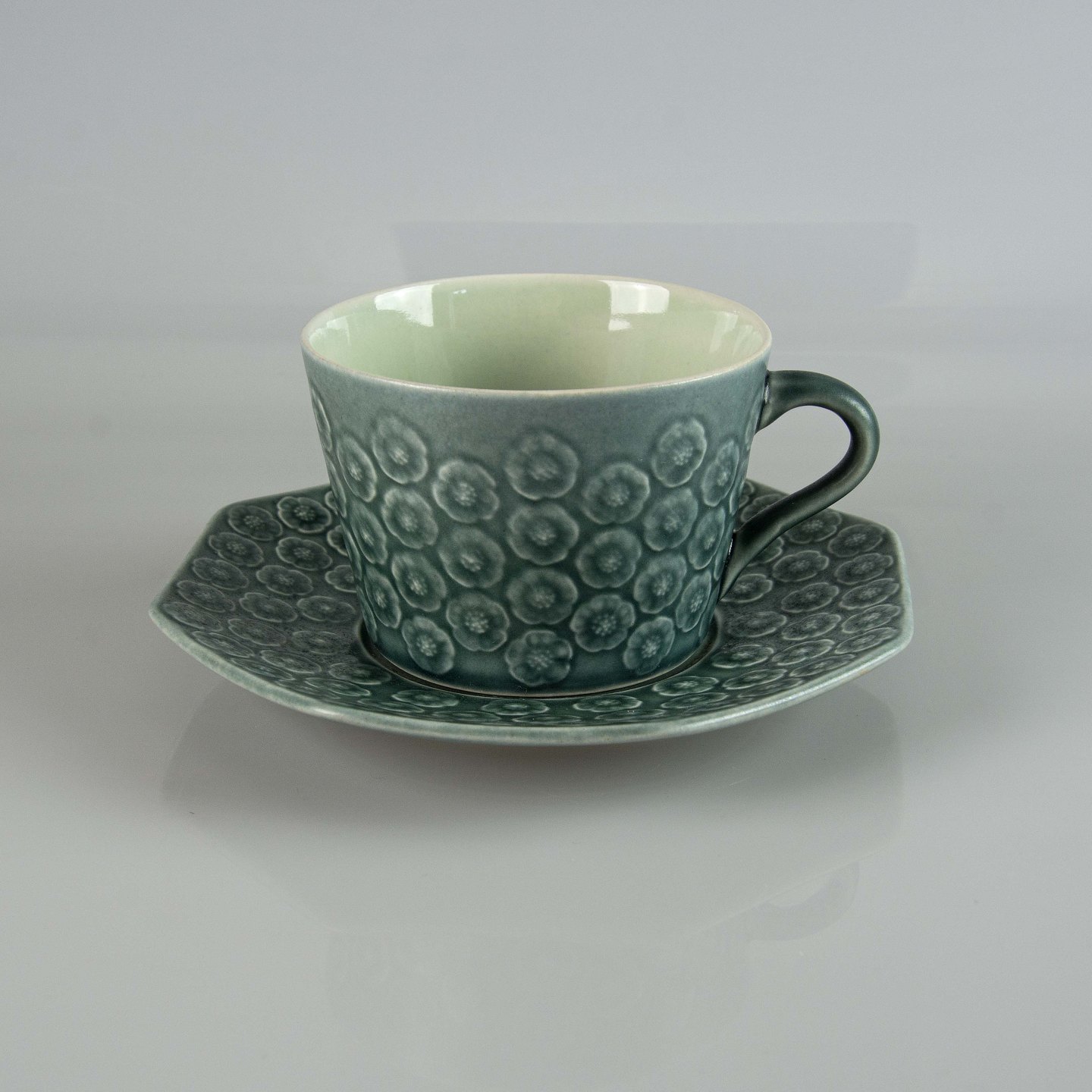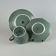 Stel i blågrøn stentøj med blomster motiver.
