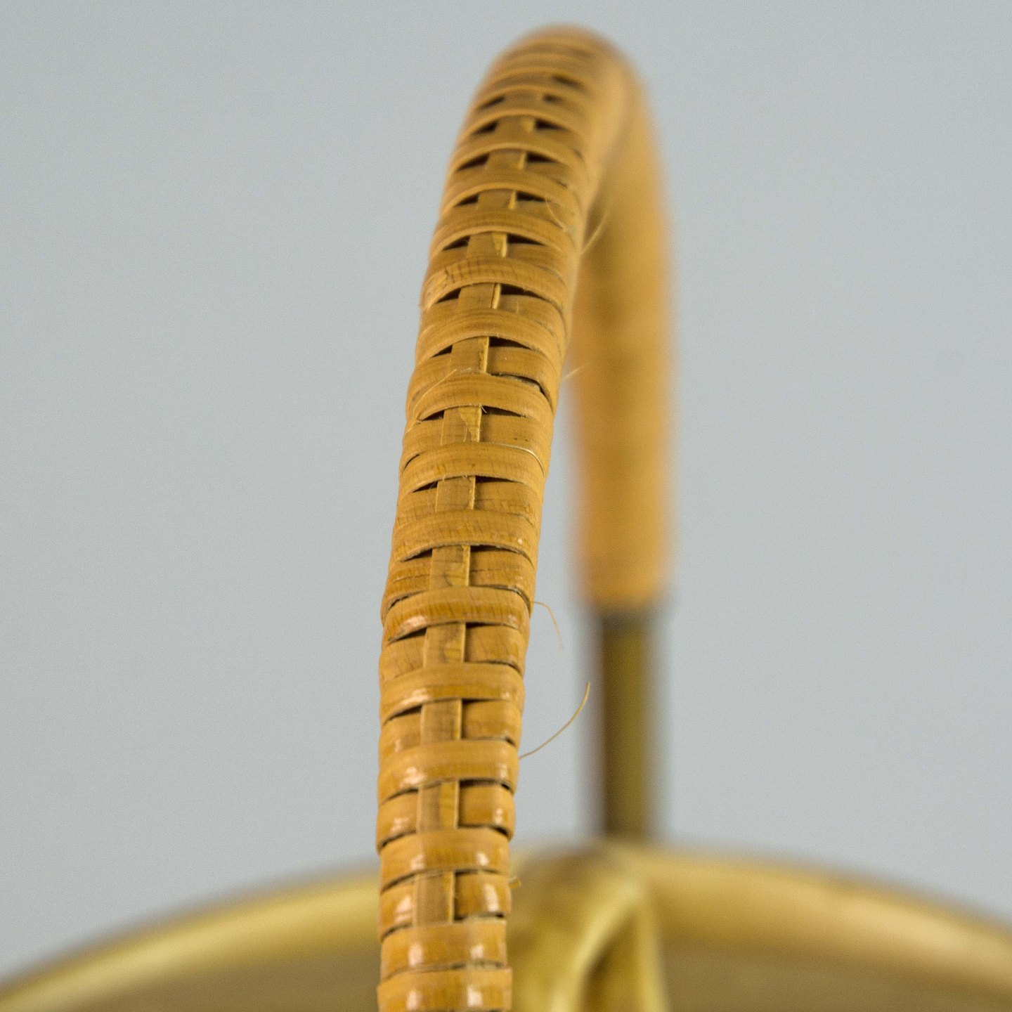 Kande i gulligt stentøj med motiv af blade og håndtag i messing beklædt med bambusflet.