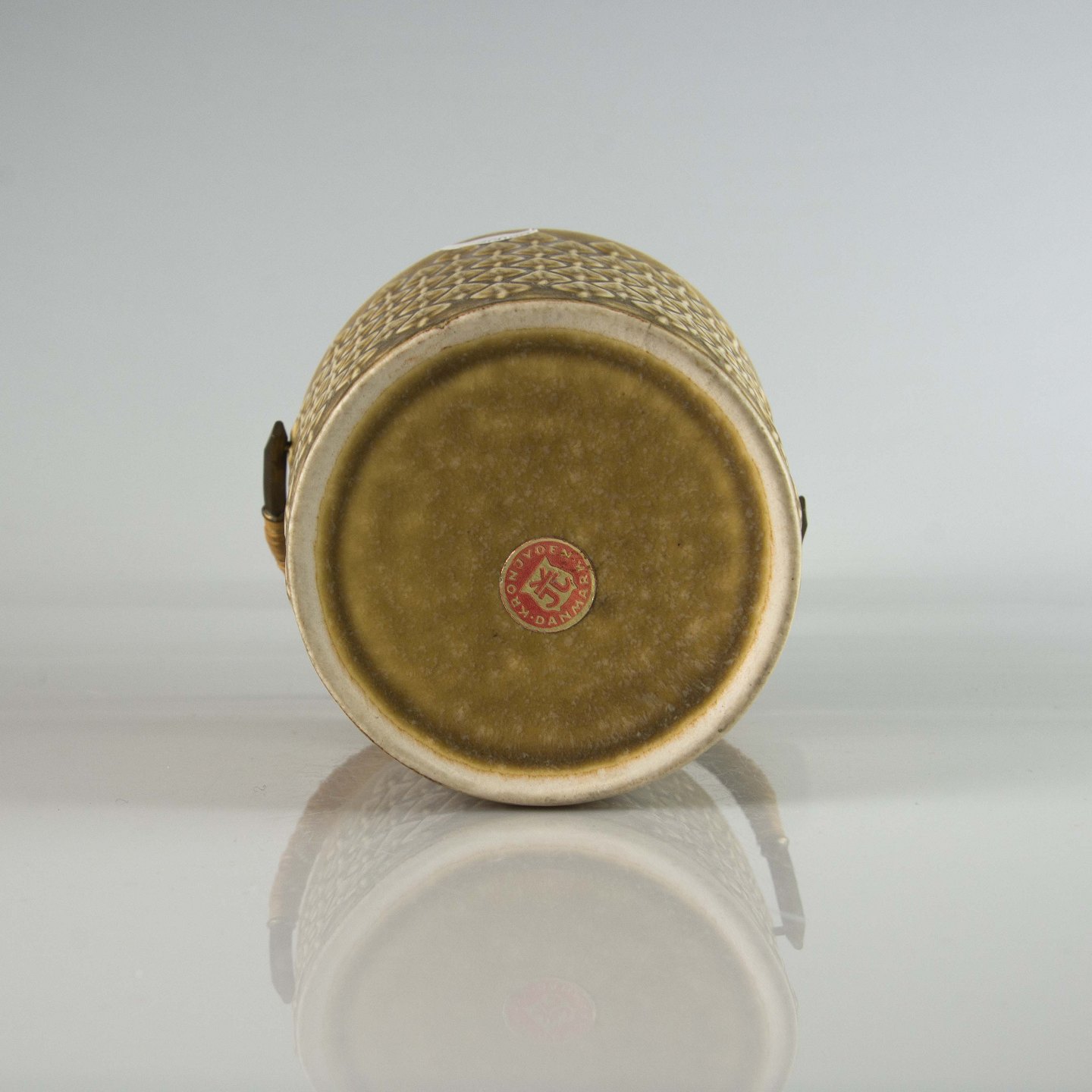 Køler i gulligt stentøj med motiv af blade og håndtag i messing beklædt med bambusflet.
