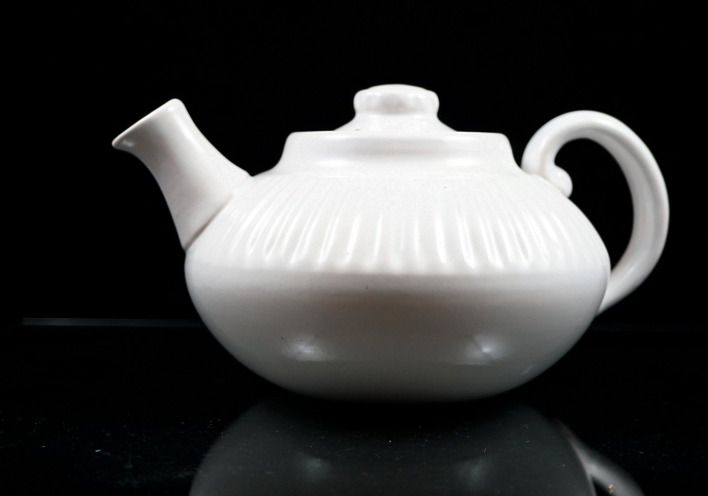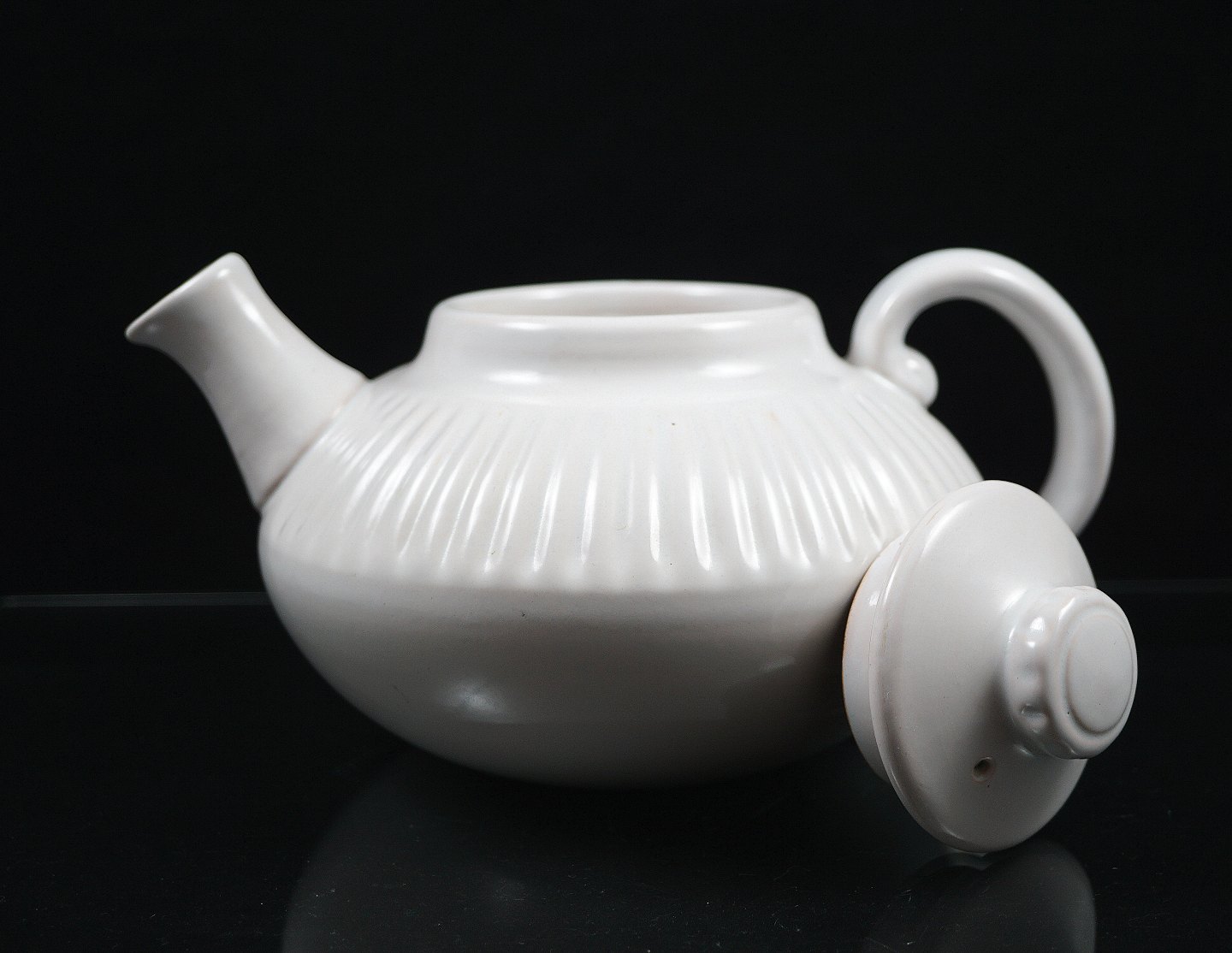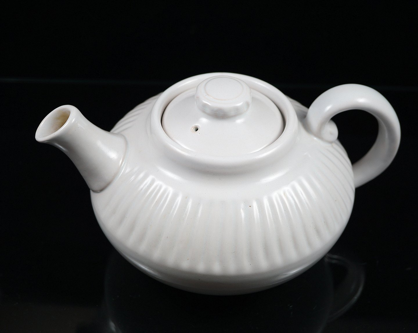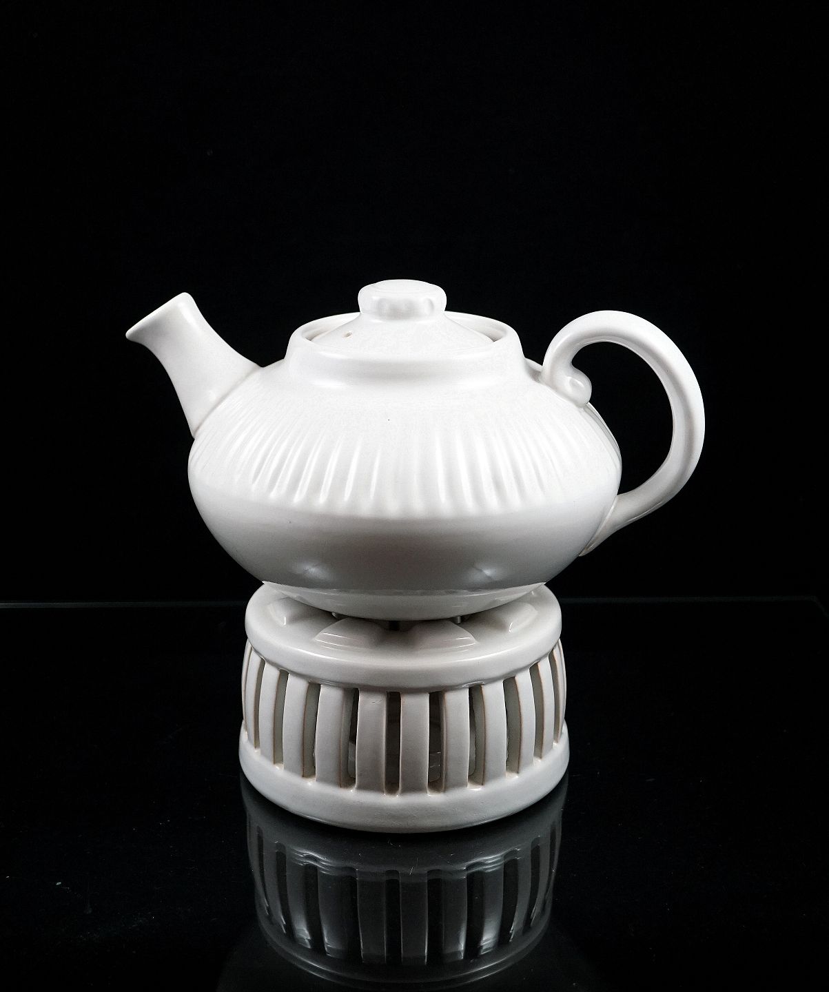 L. Hjorth. Thekande, nr. 300, fyrrefadsvarmer, nr. 301. Thekanden er riflet, begge dele er hvid glaseret. Der er ikke brugsspor på nogle af delene