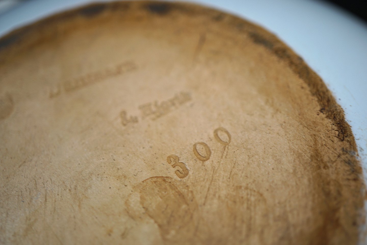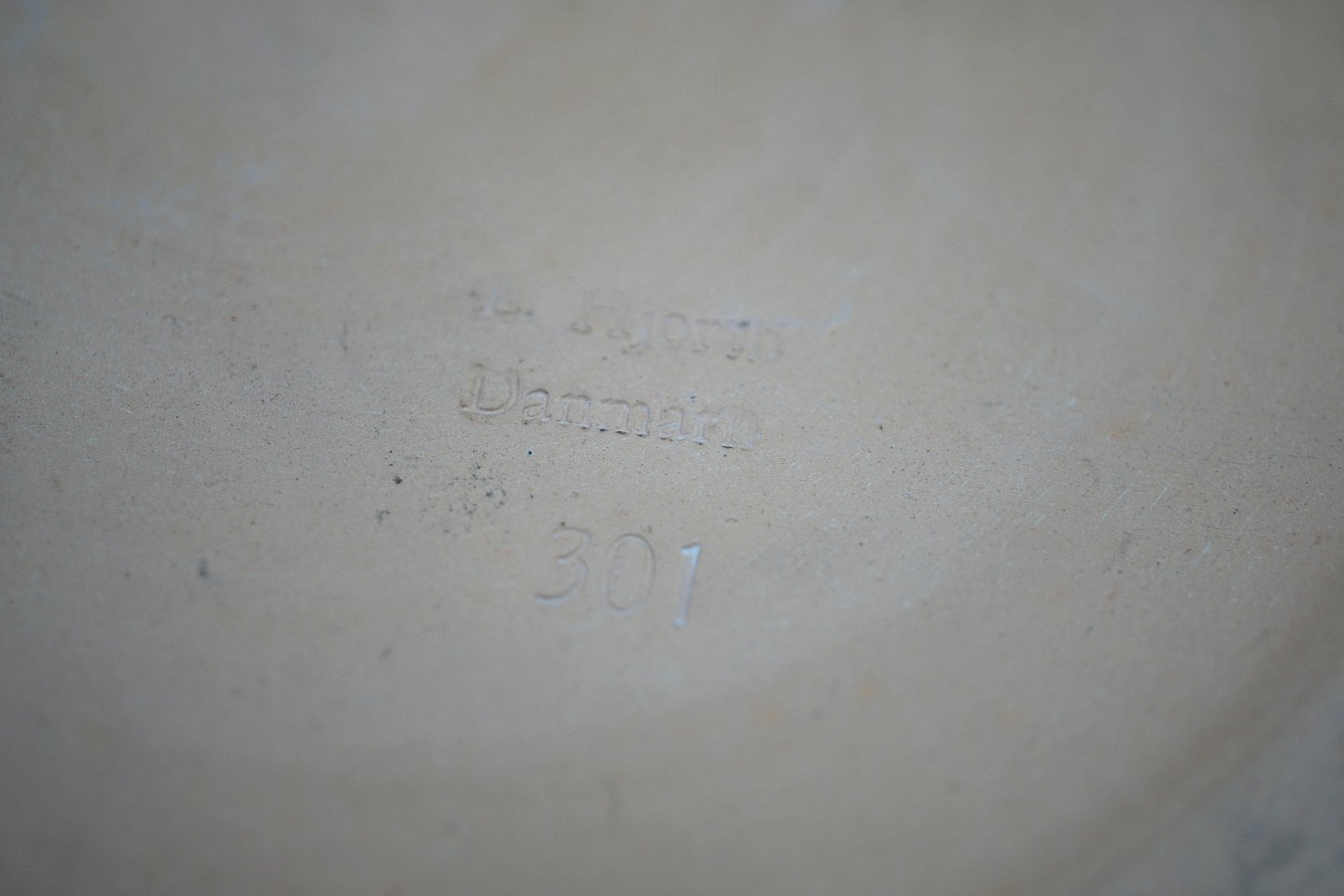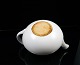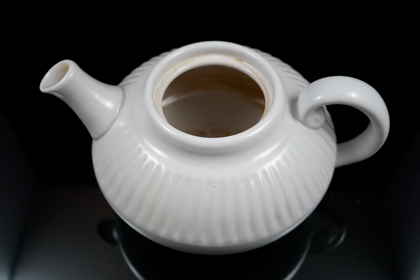L. Hjorth. Thekande, nr. 300, fyrrefadsvarmer, nr. 301. Thekanden er riflet, begge dele er hvid glaseret. Der er ikke brugsspor på nogle af delene