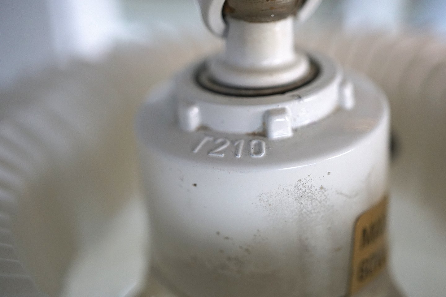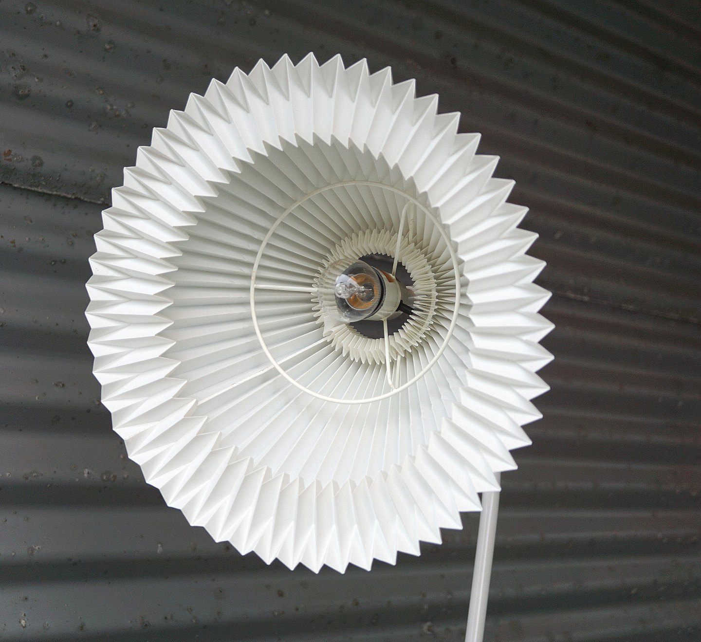 Standerlampe i mat lakeret hvidt metal. Lampen er med Le Klint skærm