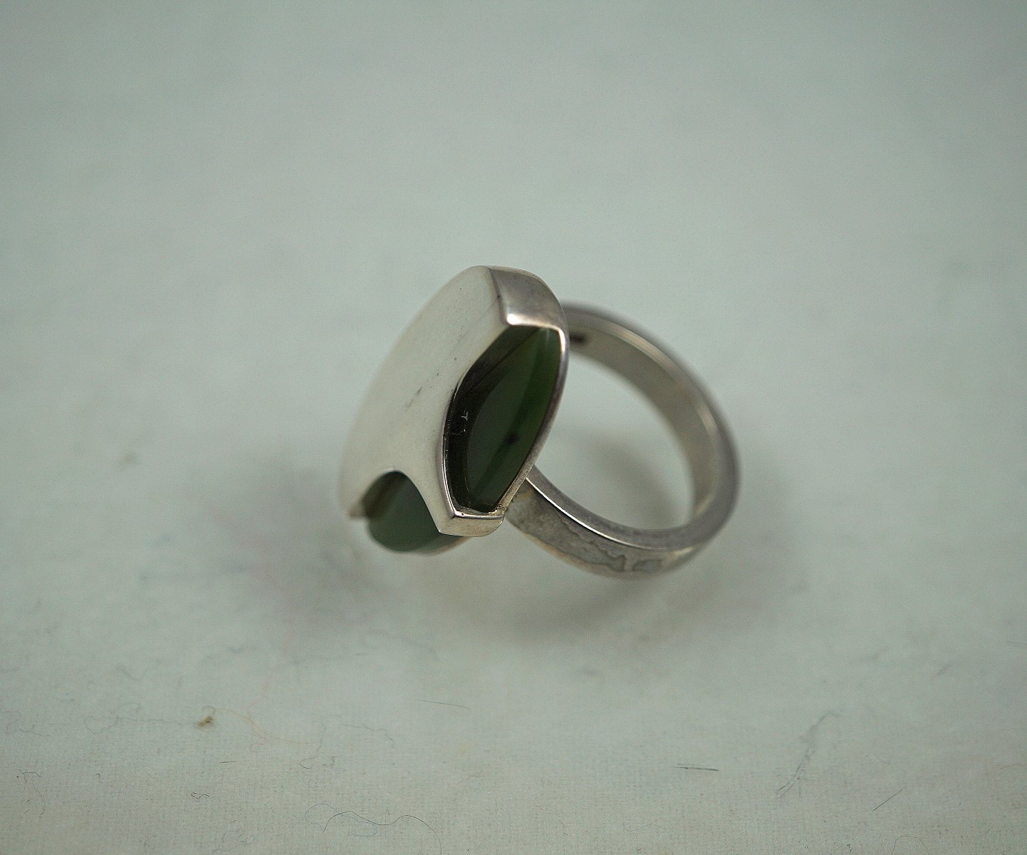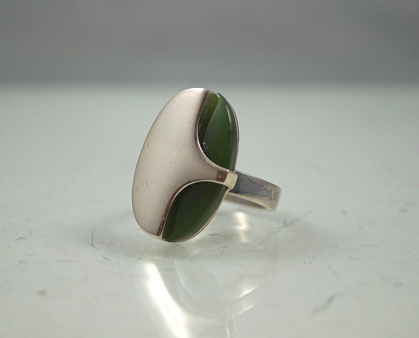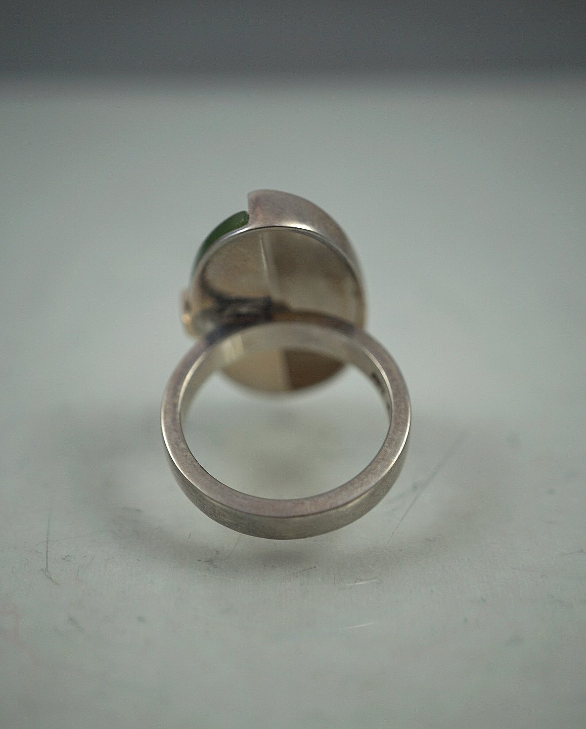 N. E. From. Ring med oval dekoration, dekorationen består af halv sølv og halv agat sten. Ring str. 18. Sterling 925s sølv