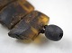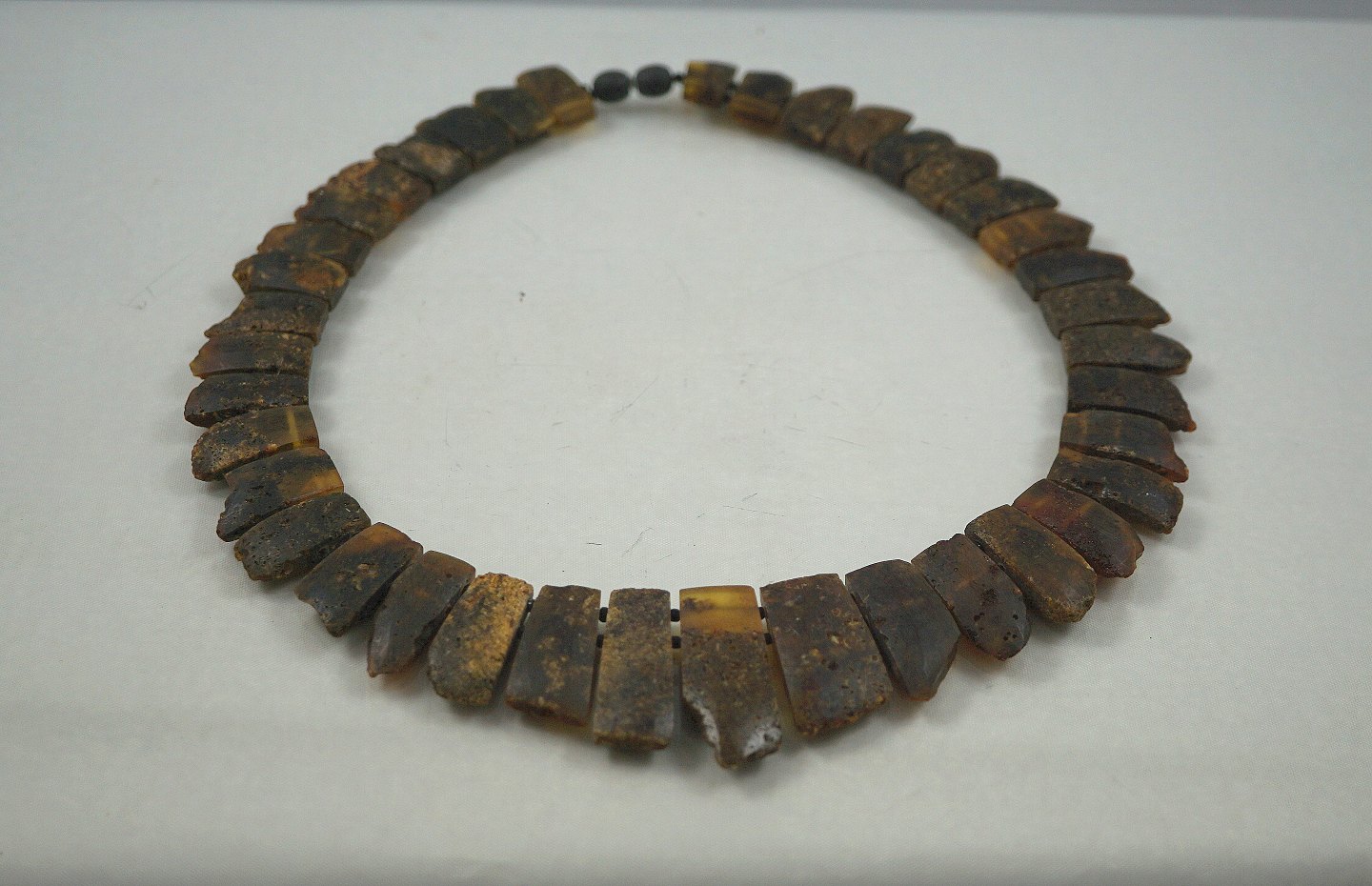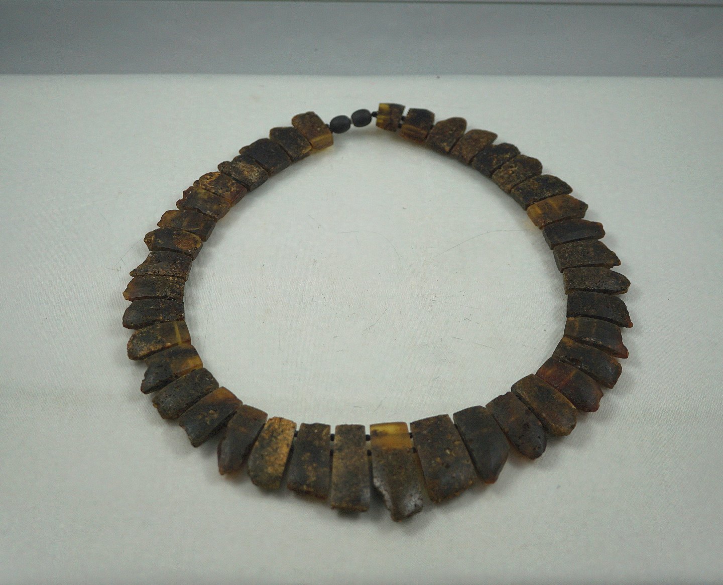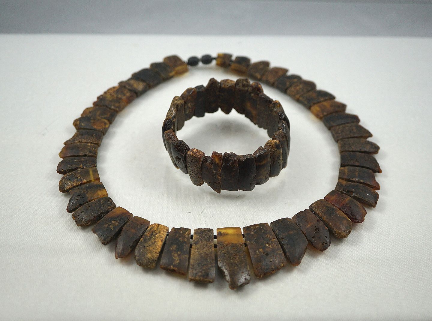 Formodentlig grønlandsk smykkesæt i rav. Der er kulstøv i ravet , deraf den mørke farve. Rav stykkerne, på kæde og armbånd er ikke poleret. rav stykkerne er sat sammen med fiskeline. der er brugsspor på smykkesættet