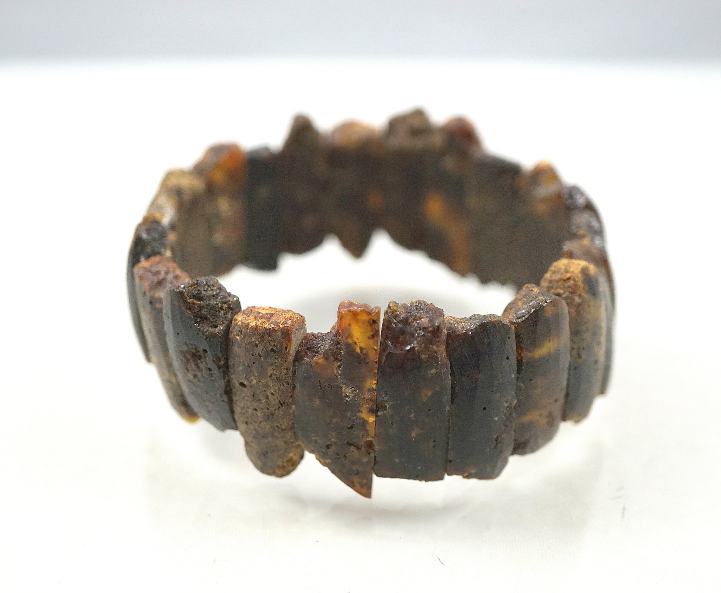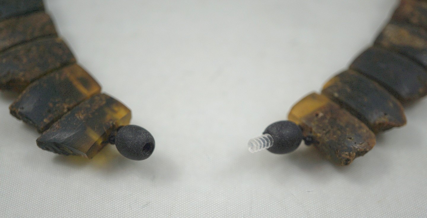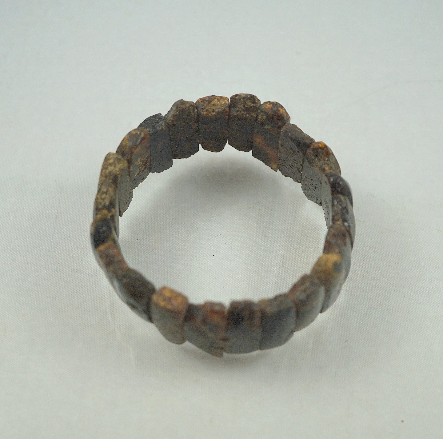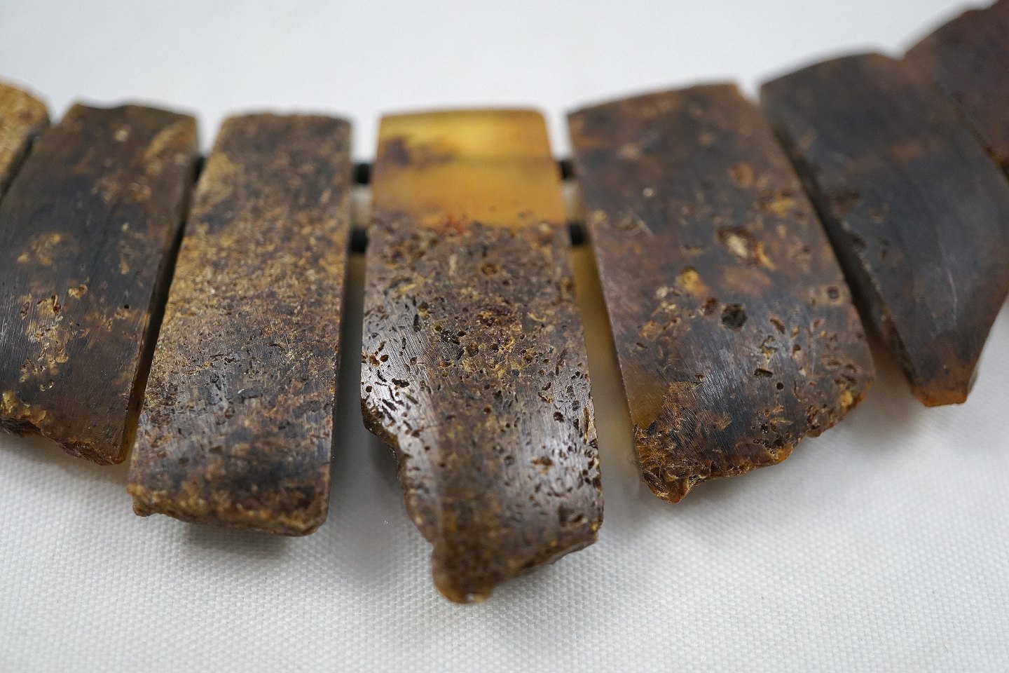 Formodentlig grønlandsk smykkesæt i rav. Der er kulstøv i ravet , deraf den mørke farve. Rav stykkerne, på kæde og armbånd er ikke poleret. rav stykkerne er sat sammen med fiskeline. der er brugsspor på smykkesættet