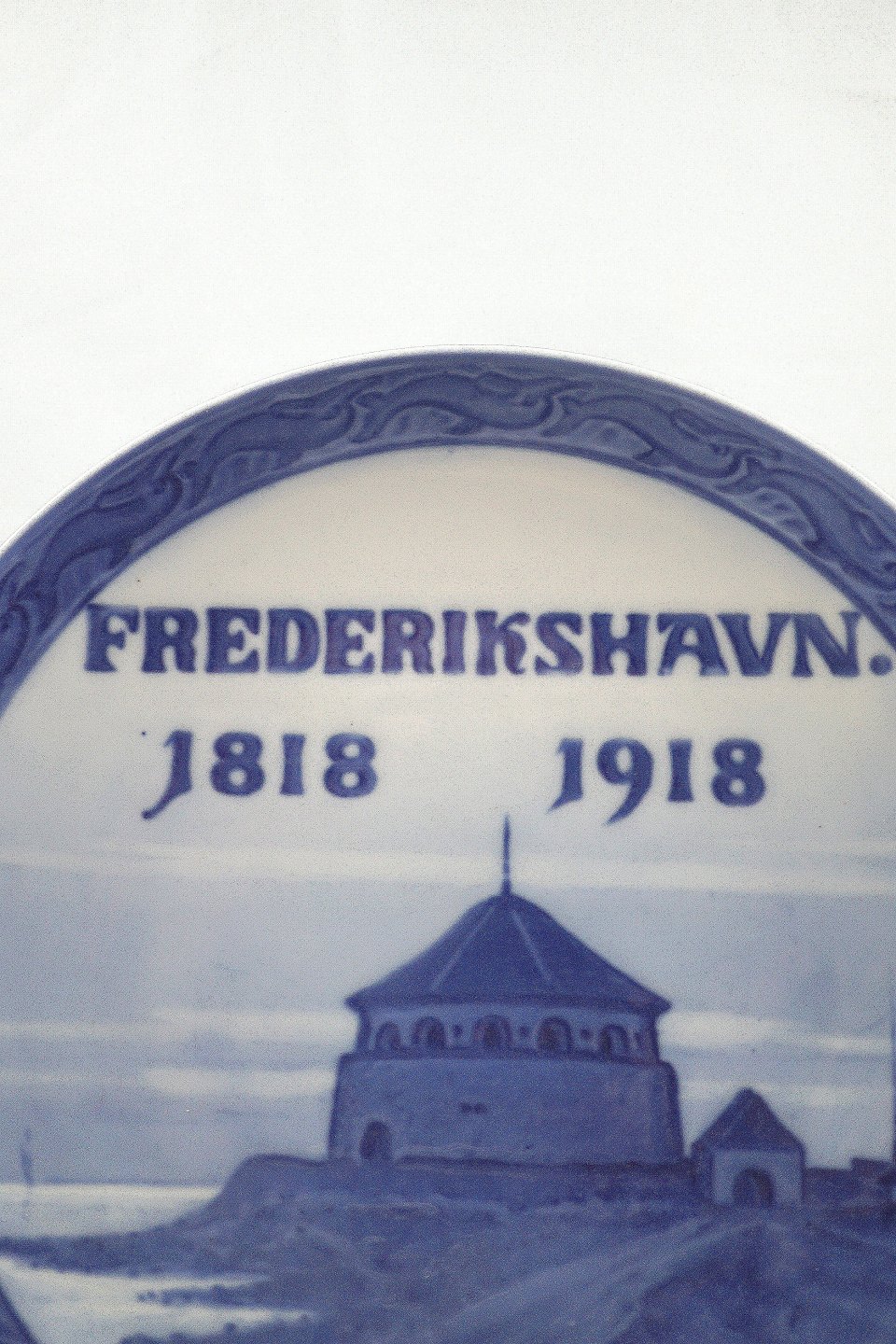 Royal Copenhagen. Minde platte med Krudttårnet i Frederikshavn 1818-1918. Platten er fremstillet i anledning af byens 100-årsjubilæum som købstad