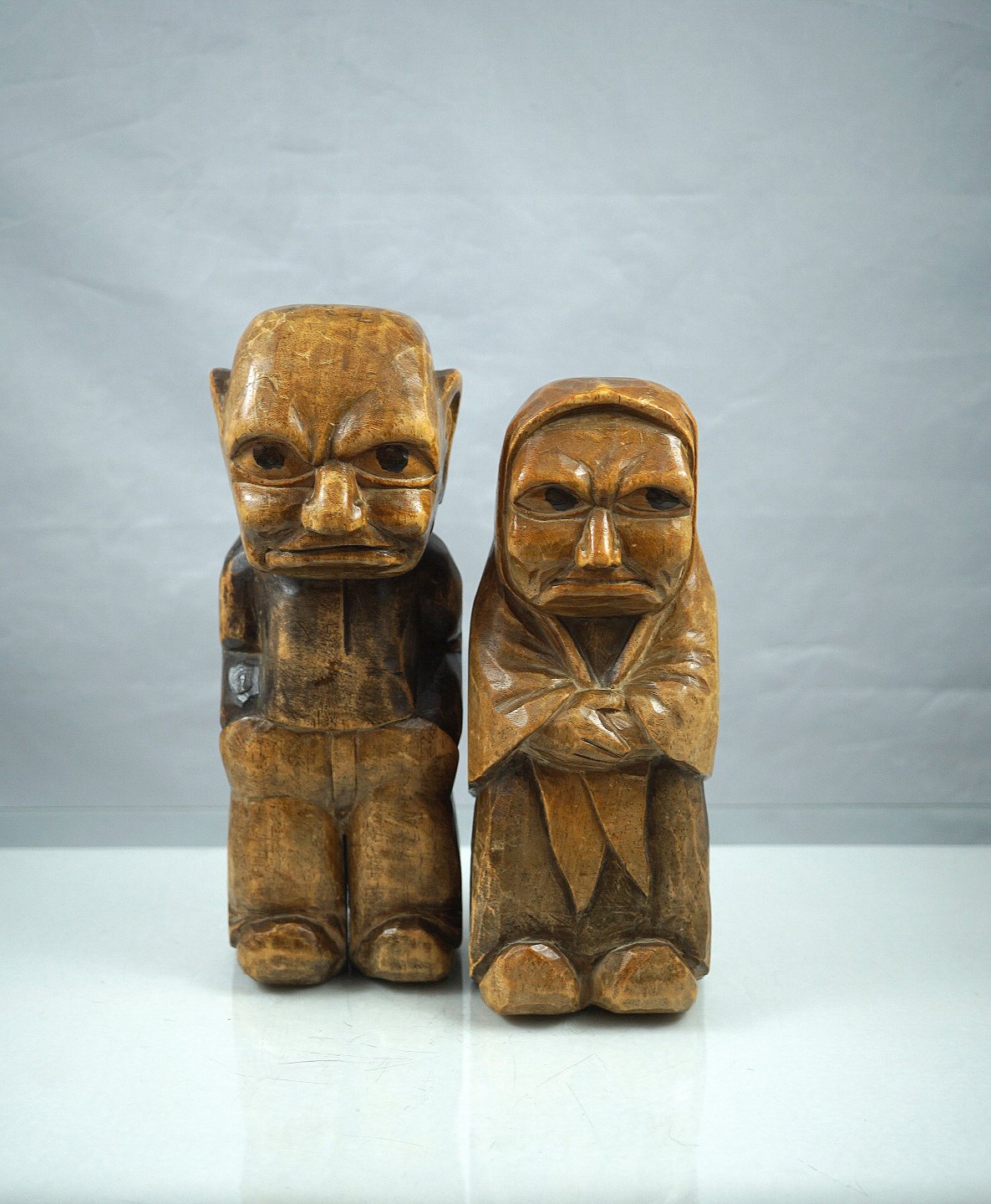 Håndsnittet DAM figurer. Figurerne er en gammel mand og en gammel kone. Manden har bukser og skjorte på, konen har kjole og tørklæde på, figurene er meget detaljeret